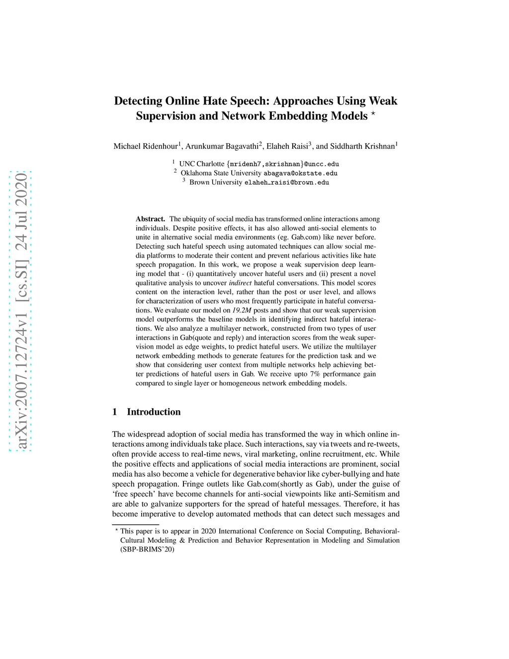 The ubiquity of social media has transformed online interactions among individuals. Despite positive effects, it has also allowed anti-social elements to unite in alternative social media environments (eg. Gab.com) like never before. Detecting such hateful speech using automated techniques can allow social media platforms to moderate their content and prevent nefarious activities like hate speech propagation. In this work, we propose a weak supervision deep learning model that - (i) quantitatively uncover hateful users and (ii) present a novel qualitative analysis to uncover indirect hateful conversations. This model scores content on the interaction level, rather than the post or user level, and allows for characterization of users who most frequently participate in hateful conversations. We evaluate our model on 19.2M posts and show that our weak supervision model outperforms the baseline models in identifying indirect hateful interactions. We also analyze a multilayer network, constructed from two types of user interactions in Gab(quote and reply) and interaction scores from the weak supervision model as edge weights, to predict hateful users. We utilize the multilayer network embedding methods to generate features for the prediction task and we show that considering user context from multiple networks help achieving better predictions of hateful users in Gab. We receive up to 7% performance gain compared to single layer or homogeneous network embedding models.