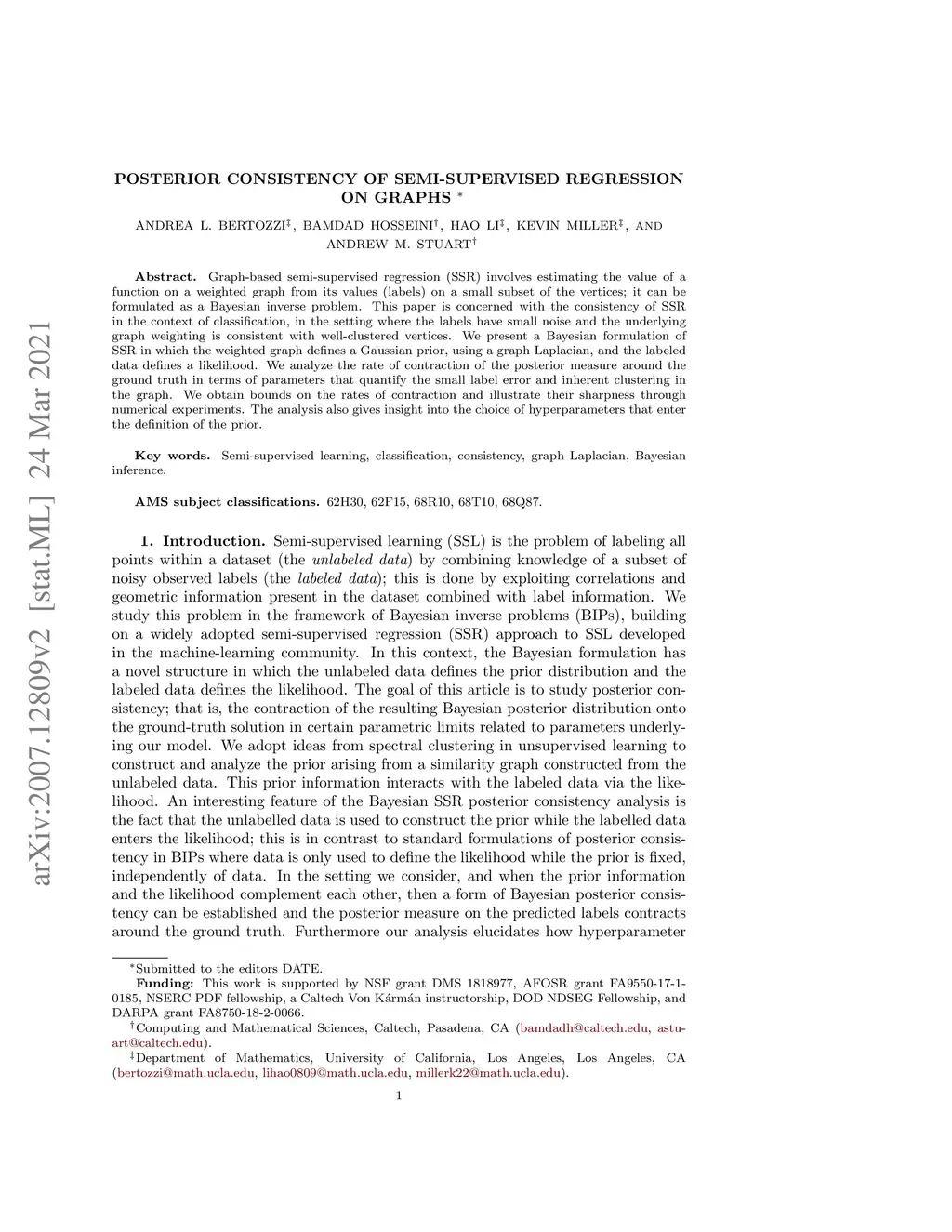 Graph-based semi-supervised regression (SSR) is the problem of estimating the value of a function on a weighted graph from its values (labels) on a small subset of the vertices. This paper is concerned with the consistency of SSR in the context of classification, in the setting where the labels have small noise and the underlying graph weighting is consistent with well-clustered nodes. We present a Bayesian formulation of SSR in which the weighted graph defines a Gaussian prior, using a graph Laplacian, and the labeled data defines a likelihood. We analyze the rate of contraction of the posterior measure around the ground truth in terms of parameters that quantify the small label error and inherent clustering in the graph. We obtain bounds on the rates of contraction and illustrate their sharpness through numerical experiments. The analysis also gives insight into the choice of hyperparameters that enter the definition of the prior.