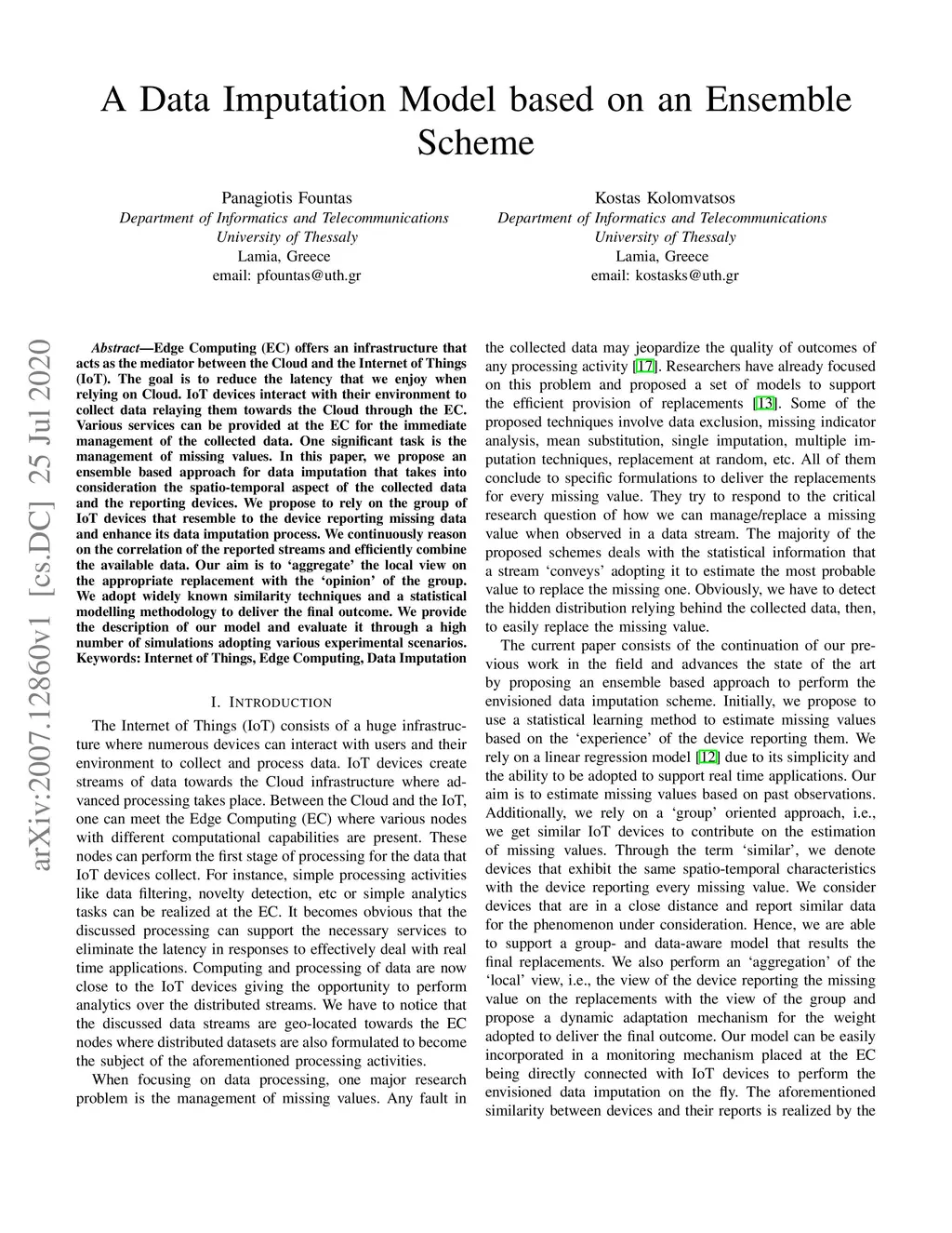 Edge Computing (EC) offers an infrastructure that acts as the mediator between the Cloud and the Internet of Things (IoT). The goal is to reduce the latency that we enjoy when relying on Cloud. IoT devices interact with their environment to collect data relaying them towards the Cloud through the EC. Various services can be provided at the EC for the immediate management of the collected data. One significant task is the management of missing values. In this paper, we propose an ensemble based approach for data imputation that takes into consideration the spatio-temporal aspect of the collected data and the reporting devices. We propose to rely on the group of IoT devices that resemble to the device reporting missing data and enhance its data imputation process. We continuously reason on the correlation of the reported streams and efficiently combine the available data. Our aim is to `aggregate' the local view on the appropriate replacement with the `opinion' of the group. We adopt widely known similarity techniques and a statistical modelling methodology to deliver the final outcome. We provide the description of our model and evaluate it through a high number of simulations adopting various experimental scenarios.