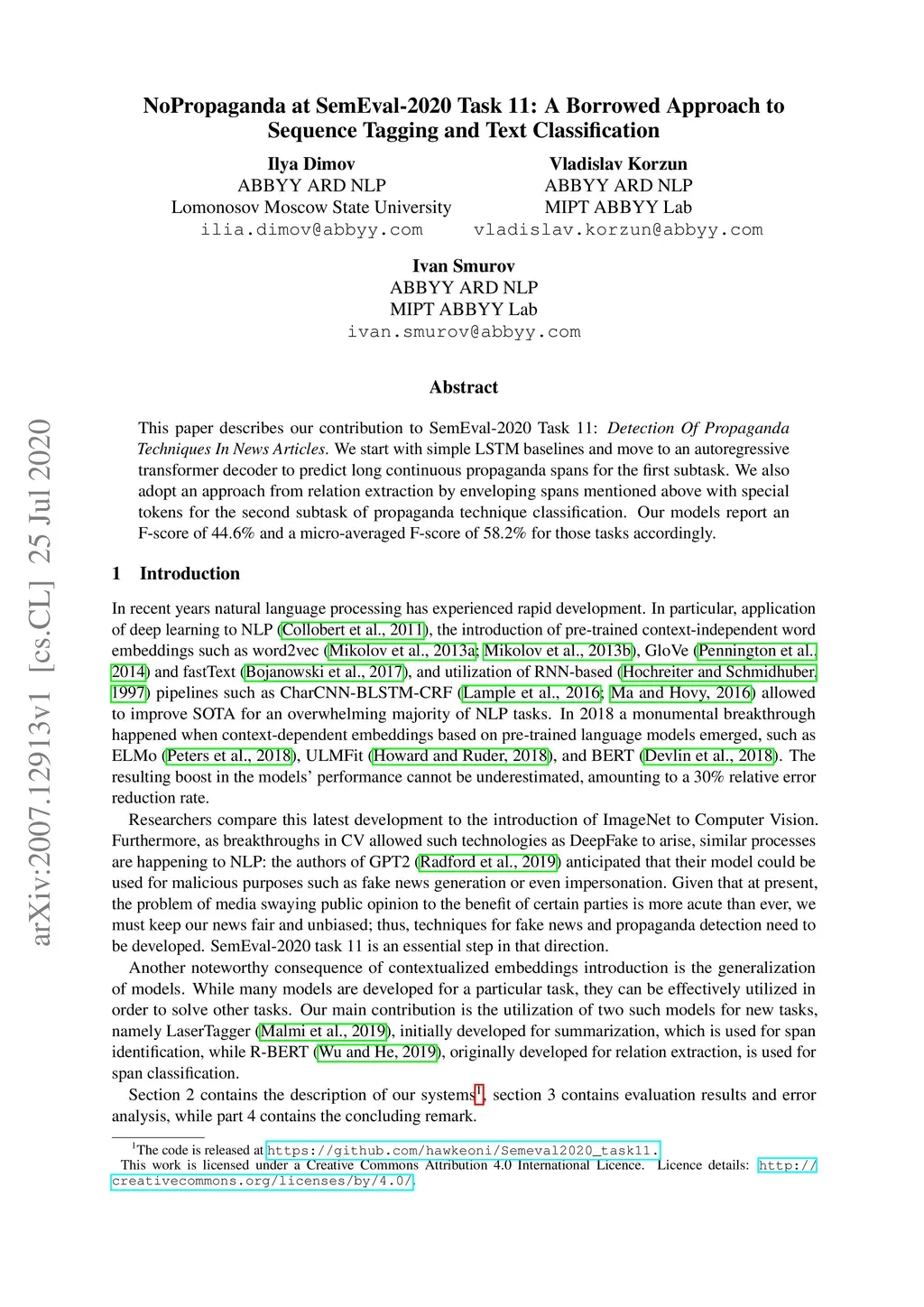 NoPropaganda at SemEval-2020 Task 11: A Borrowed Approach to Sequence