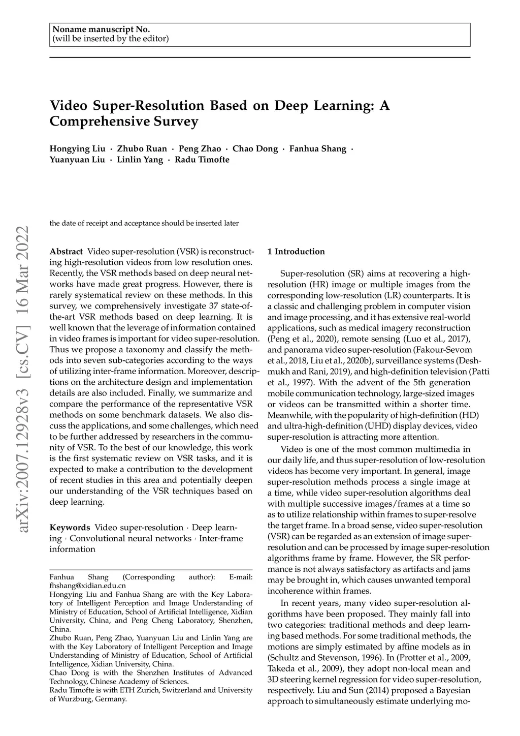In recent years, deep learning has made great progress in many fields such as image recognition, natural language processing, speech recognition and video super-resolution. In this survey, we comprehensively investigate 33 state-of-the-art video super-resolution (VSR) methods based on deep learning. It is well known that the leverage of information within video frames is important for video super-resolution. Thus we propose a taxonomy and classify the methods into six sub-categories according to the ways of utilizing inter-frame information. Moreover, the architectures and implementation details of all the methods are depicted in detail. Finally, we summarize and compare the performance of the representative VSR method on some benchmark datasets. We also discuss some challenges, which need to be further addressed by researchers in the community of VSR. To the best of our knowledge, this work is the first systematic review on VSR tasks, and it is expected to make a contribution to the development of recent studies in this area and potentially deepen our understanding to the VSR techniques based on deep learning.