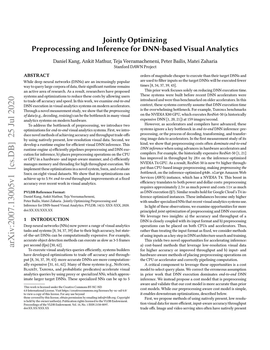 While deep neural networks (DNNs) are an increasingly popular way to query large corpora of data, their significant runtime remains an active area of research. As a result, researchers have proposed systems and optimizations to reduce these costs by allowing users to trade off accuracy and speed. In this work, we examine end-to-end DNN execution in visual analytics systems on modern accelerators. Through a novel measurement study, we show that the preprocessing of data (e.g., decoding, resizing) can be the bottleneck in many visual analytics systems on modern hardware. To address the bottleneck of preprocessing, we introduce two optimizations for end-to-end visual analytics systems. First, we introduce novel methods of achieving accuracy and throughput trade-offs by using natively present, low-resolution visual data. Second, we develop a runtime engine for efficient visual DNN inference. This runtime engine a) efficiently pipelines preprocessing and DNN execution for inference, b) places preprocessing operations on the CPU or GPU in a hardware- and input-aware manner, and c) efficiently manages memory and threading for high throughput execution. We implement these optimizations in a novel system, Smol, and evaluate Smol on eight visual datasets. We show that its optimizations can achieve up to 5.9x end-to-end throughput improvements at a fixed accuracy over recent work in visual analytics.