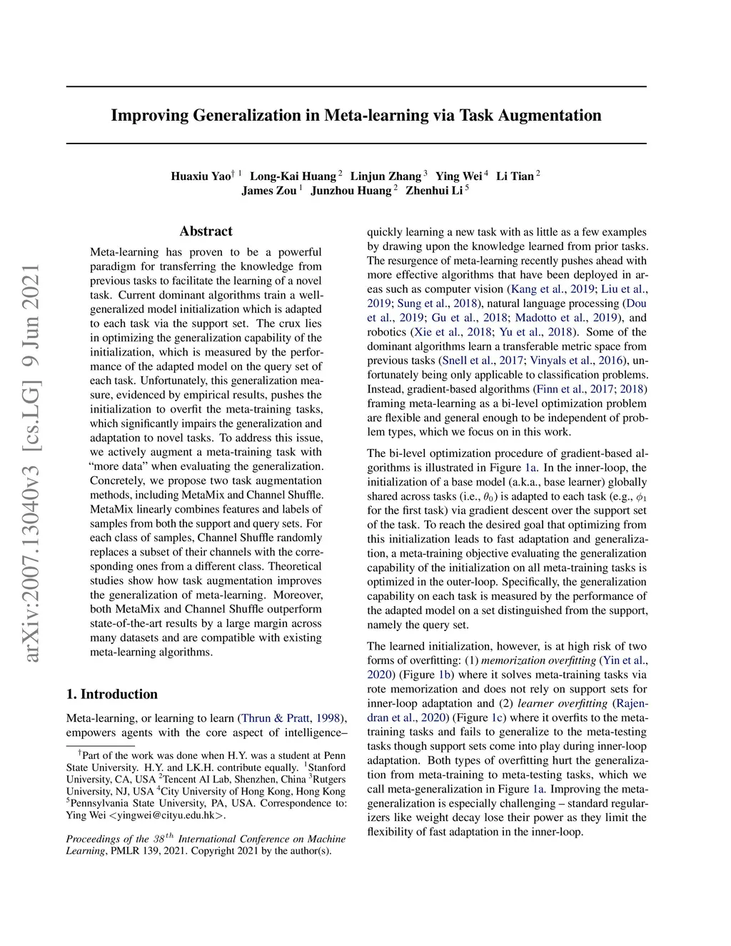 Meta-learning has proven to be a powerful paradigm for transferring the knowledge from previous tasks to facilitate the learning of a novel task. Current dominant algorithms train a well-generalized model initialization which is adapted to each task via the support set. The crux lies in optimizing the generalization capability of the initialization, which is measured by the performance of the adapted model on the query set of each task. Unfortunately, this generalization measure, evidenced by empirical results, pushes the initialization to overfit the meta-training tasks, which significantly impairs the generalization and adaptation to novel tasks. To address this issue, we actively augment a meta-training task with "more data" when evaluating the generalization. Concretely, we propose two task augmentation methods, including MetaMix and Channel Shuffle. MetaMix linearly combines features and labels of samples from both the support and query sets. For each class of samples, Channel Shuffle randomly replaces a subset of their channels with the corresponding ones from a different class. Theoretical studies show how task augmentation improves the generalization of meta-learning. Moreover, both MetaMix and Channel Shuffle outperform state-of-the-art results by a large margin across many datasets and are compatible with existing meta-learning algorithms.
