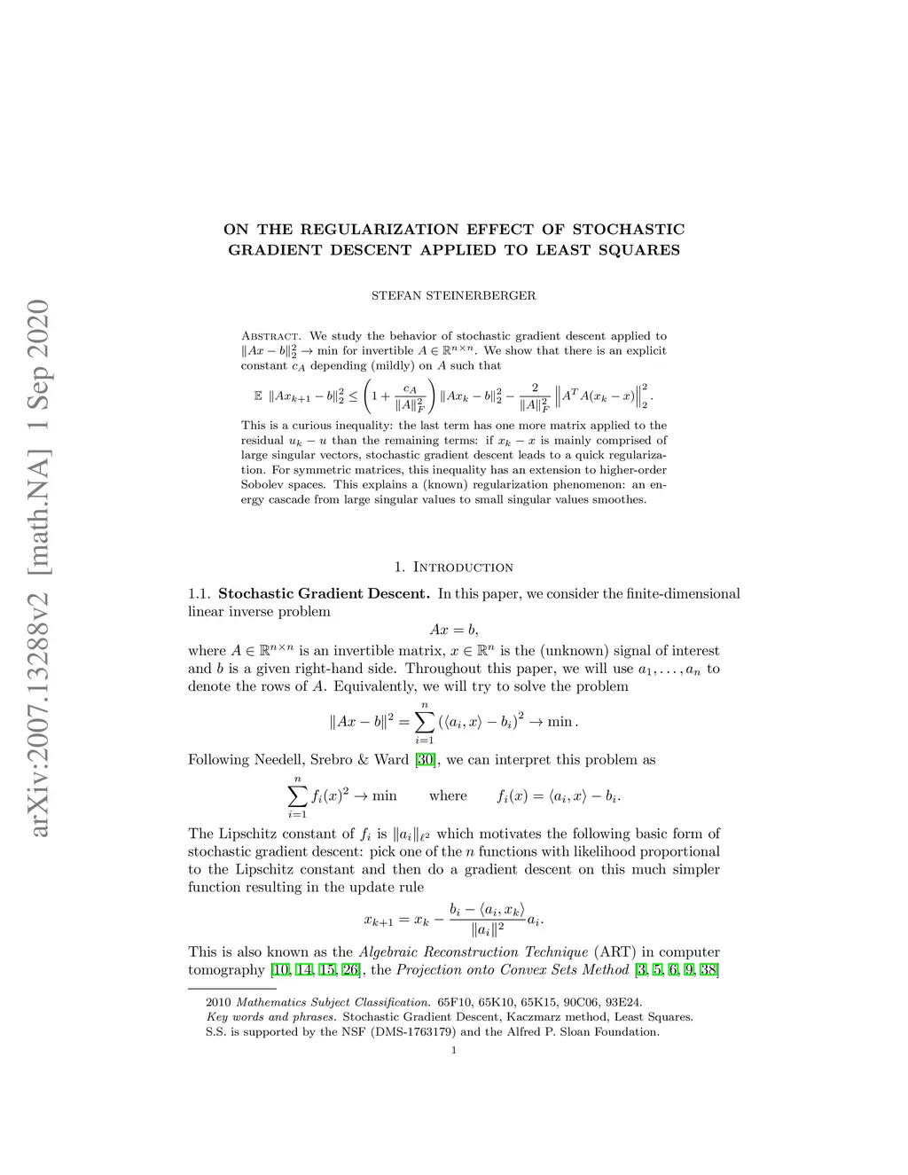 We study the behavior of stochastic gradient descent applied to for invertible . We show that there is an explicit constant depending (mildly) on such that This is a curious inequality: the last term has one more matrix applied to the residual than the remaining terms: if is mainly comprised of large singular vectors, stochastic gradient descent leads to a quick regularization. For symmetric matrices, this inequality has an extension to higher-order Sobolev spaces. This explains a (known) regularization phenomenon: an energy cascade from large singular values to small singular values smoothes.