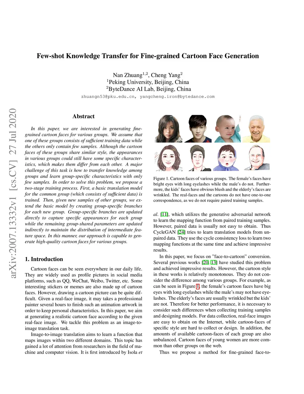 In this paper, we are interested in generating fine-grained cartoon faces for various groups. We assume that one of these groups consists of sufficient training data while the others only contain few samples. Although the cartoon faces of these groups share similar style, the appearances in various groups could still have some specific characteristics, which makes them differ from each other. A major challenge of this task is how to transfer knowledge among groups and learn group-specific characteristics with only few samples. In order to solve this problem, we propose a two-stage training process. First, a basic translation model for the basic group (which consists of sufficient data) is trained. Then, given new samples of other groups, we extend the basic model by creating group-specific branches for each new group. Group-specific branches are updated directly to capture specific appearances for each group while the remaining group-shared parameters are updated indirectly to maintain the distribution of intermediate feature space. In this manner, our approach is capable to generate high-quality cartoon faces for various groups.
