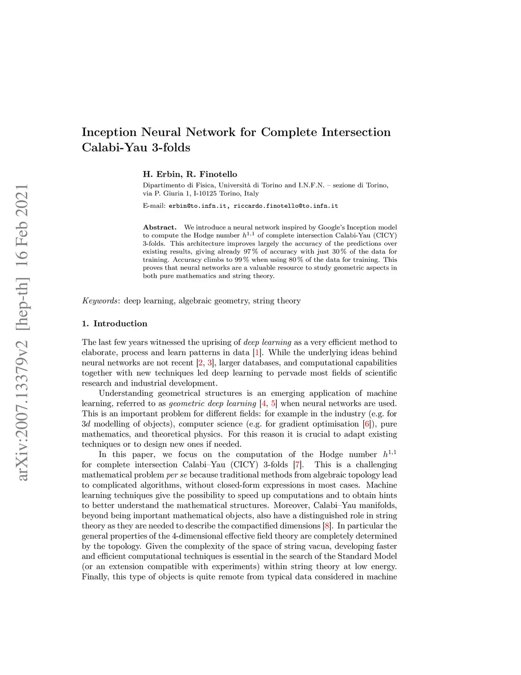 We introduce a neural network inspired by Google's Inception model to compute the Hodge number of complete intersection Calabi-Yau (CICY) 3-folds. This architecture improves largely the accuracy of the predictions over existing results, giving already 97% of accuracy with just 30% of the data for training. Moreover, accuracy climbs to 99% when using 80% of the data for training. This proves that neural networks are a valuable resource to study geometric aspects in both pure mathematics and string theory.