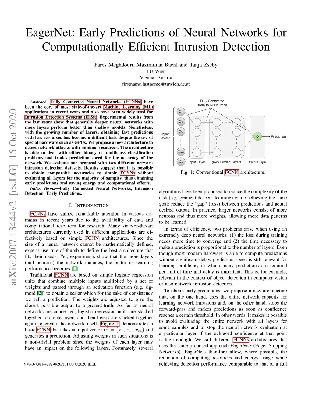 Fully Connected Neural Networks (FCNNs) have been the core of most state-of-the-art Machine Learning (ML) applications in recent years and also have been widely used for Intrusion Detection Systems (IDSs). Experimental results from the last years show that generally deeper neural networks with more layers perform better than shallow models. Nonetheless, with the growing number of layers, obtaining fast predictions with less resources has become a difficult task despite the use of special hardware such as GPUs. We propose a new architecture to detect network attacks with minimal resources. The architecture is able to deal with either binary or multiclass classification problems and trades prediction speed for the accuracy of the network. We evaluate our proposal with two different network intrusion detection datasets. Results suggest that it is possible to obtain comparable accuracies to simple FCNNs without evaluating all layers for the majority of samples, thus obtaining early predictions and saving energy and computational efforts.