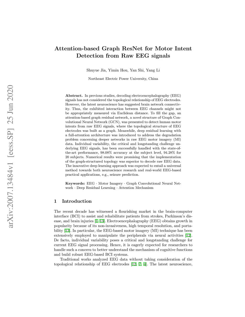 In previous studies, decoding electroencephalography (EEG) signals has not considered the topological relationship of EEG electrodes. However, the latest neuroscience has suggested brain network connectivity. Thus, the exhibited interaction between EEG channels might not be appropriately measured via Euclidean distance. To fill the gap, an attention-based graph residual network, a novel structure of Graph Convolutional Neural Network (GCN), was presented to detect human motor intents from raw EEG signals, where the topological structure of EEG electrodes was built as a graph. Meanwhile, deep residual learning with a full-attention architecture was introduced to address the degradation problem concerning deeper networks in raw EEG motor imagery (MI) data. Individual variability, the critical and longstanding challenge underlying EEG signals, has been successfully handled with the state-of-the-art performance, 98.08% accuracy at the subject level, 94.28% for 20 subjects. Numerical results were promising that the implementation of the graph-structured topology was superior to decode raw EEG data. The innovative deep learning approach was expected to entail a universal method towards both neuroscience research and real-world EEG-based practical applications, e.g., seizure prediction.