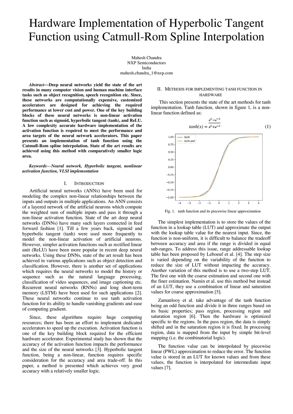 Deep neural networks yield the state of the art results in many computer vision and human machine interface tasks such as object recognition, speech recognition etc. Since, these networks are computationally expensive, customized accelerators are designed for achieving the required performance at lower cost and power. One of the key building blocks of these neural networks is non-linear activation function such as sigmoid, hyperbolic tangent (tanh), and ReLU. A low complexity accurate hardware implementation of the activation function is required to meet the performance and area targets of the neural network accelerators. This paper presents an implementation of tanh function using the Catmull-Rom spline interpolation. State of the art results are achieved using this method with comparatively smaller logic area.