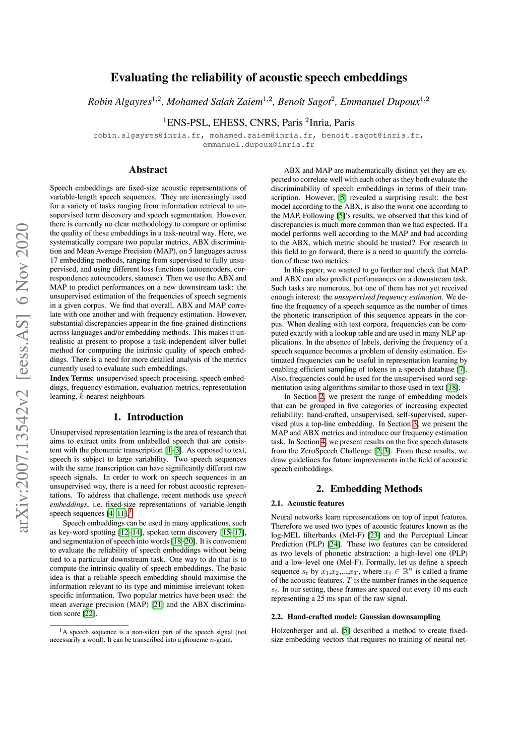 Speech embeddings are fixed-size acoustic representations of variable-length speech sequences. They are increasingly used for a variety of tasks ranging from information retrieval to unsupervised term discovery and speech segmentation. However, there is currently no clear methodology to compare or optimise the quality of these embeddings in a task-neutral way. Here, we systematically compare two popular metrics, ABX discrimination and Mean Average Precision (MAP), on 5 languages across 17 embedding methods, ranging from supervised to fully unsupervised, and using different loss functions (autoencoders, correspondence autoencoders, siamese). Then we use the ABX and MAP to predict performances on a new downstream task: the unsupervised estimation of the frequencies of speech segments in a given corpus. We find that overall, ABX and MAP correlate with one another and with frequency estimation. However, substantial discrepancies appear in the fine-grained distinctions across languages and/or embedding methods. This makes it unrealistic at present to propose a task-independent silver bullet method for computing the intrinsic quality of speech embeddings. There is a need for more detailed analysis of the metrics currently used to evaluate such embeddings.