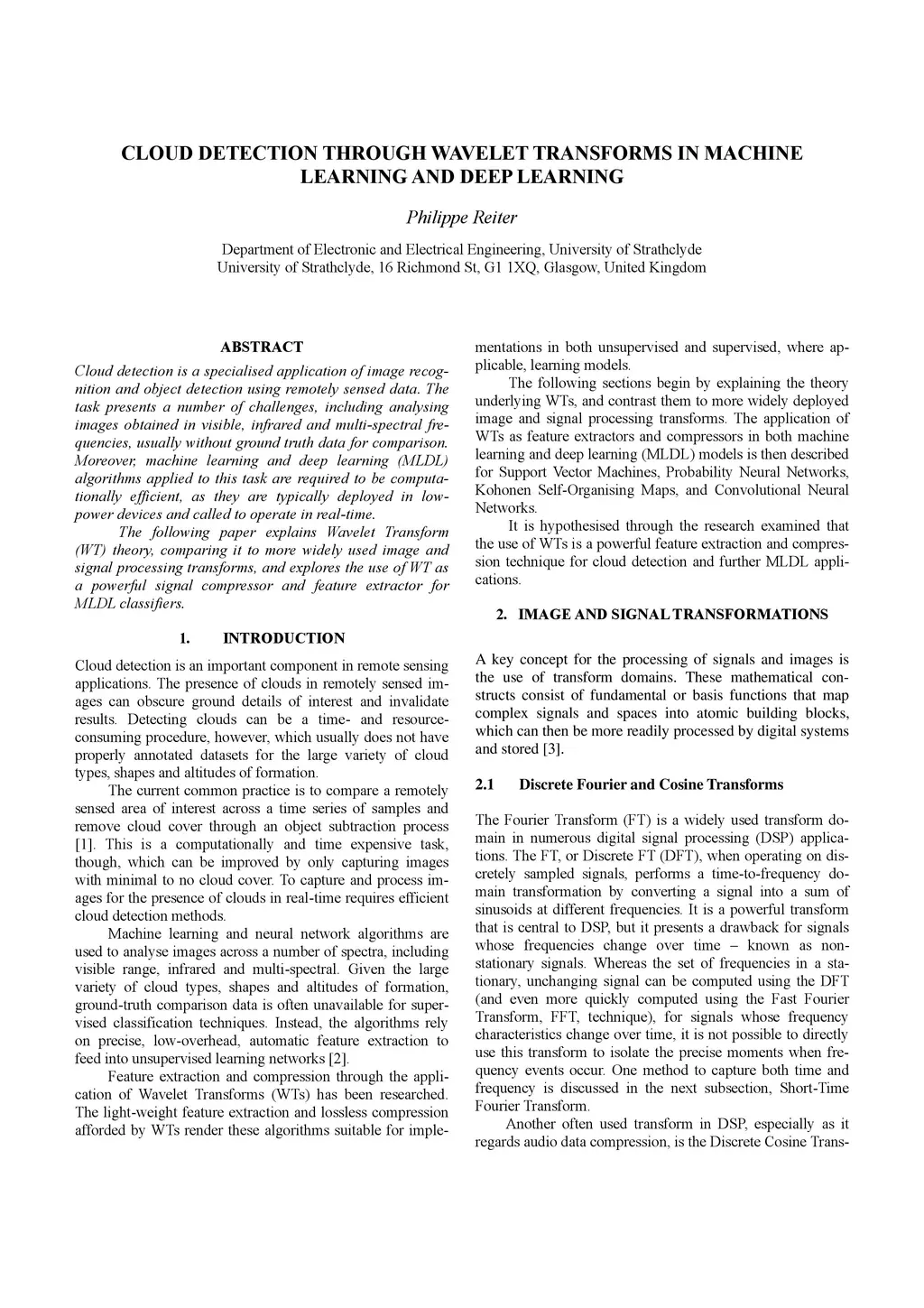 Cloud detection is a specialized application of image recognition and object detection using remotely sensed data. The task presents a number of challenges, including analyzing images obtained in visible, infrared and multi-spectral frequencies, usually without ground truth data for comparison. Moreover, machine learning and deep learning (MLDL) algorithms applied to this task are required to be computationally efficient, as they are typically deployed in low-power devices and called to operate in real-time. This paper explains Wavelet Transform (WT) theory, comparing it to more widely used image and signal processing transforms, and explores the use of WT as a powerful signal compressor and feature extractor for MLDL classifiers.