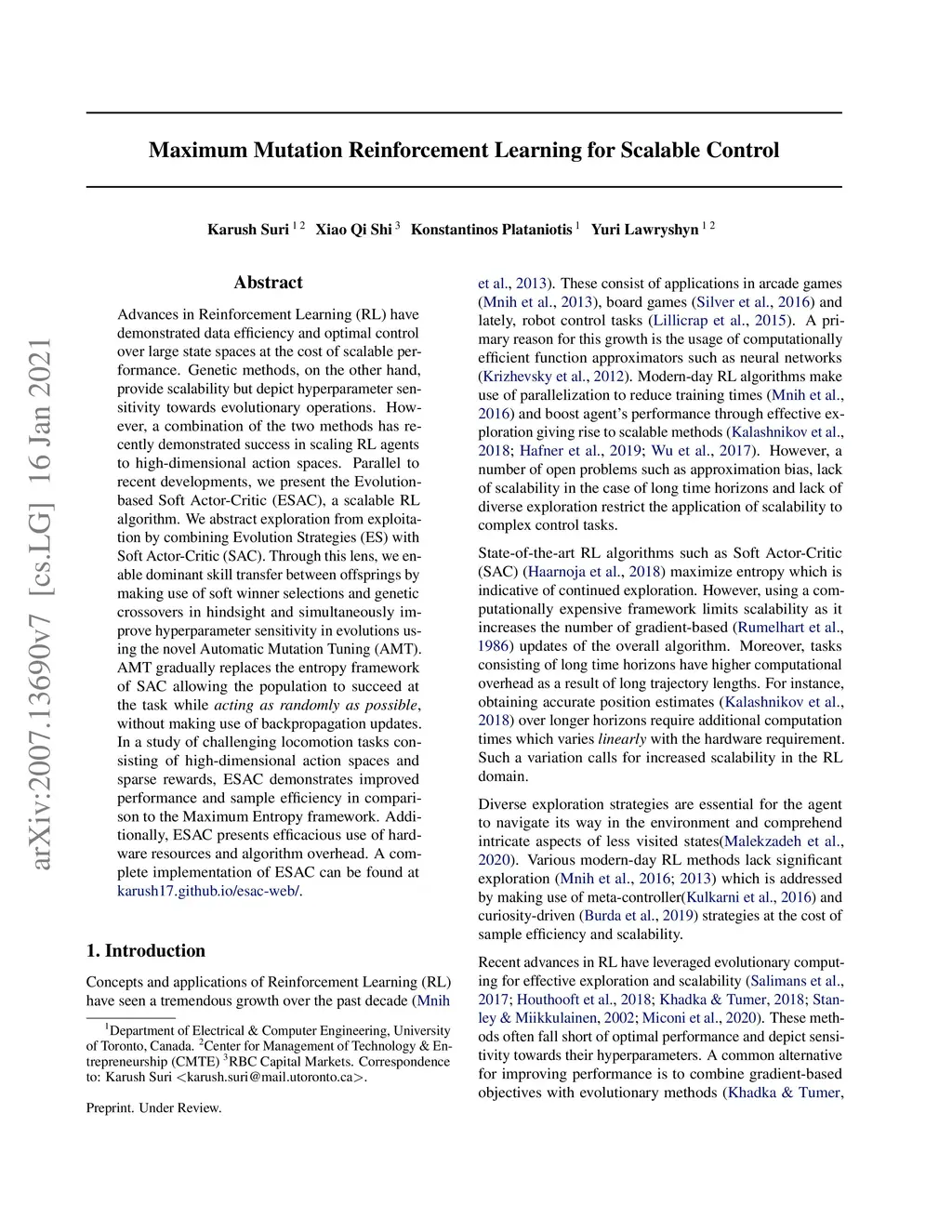 Advances in Reinforcement Learning (RL) have demonstrated data efficiency and optimal control over large state spaces at the cost of scalable performance. Genetic methods, on the other hand, provide scalability but depict hyperparameter sensitivity towards evolutionary operations. However, a combination of the two methods has recently demonstrated success in scaling RL agents to high-dimensional action spaces. Parallel to recent developments, we present the Evolution-based Soft Actor-Critic (ESAC), a scalable RL algorithm. We abstract exploration from exploitation by combining Evolution Strategies (ES) with Soft Actor-Critic (SAC). Through this lens, we enable dominant skill transfer between offsprings by making use of soft winner selections and genetic crossovers in hindsight and simultaneously improve hyperparameter sensitivity in evolutions using the novel Automatic Mutation Tuning (AMT). AMT gradually replaces the entropy framework of SAC allowing the population to succeed at the task while acting as randomly as possible, without making use of backpropagation updates. In a study of challenging locomotion tasks consisting of high-dimensional action spaces and sparse rewards, ESAC demonstrates improved performance and sample efficiency in comparison to the Maximum Entropy framework. Additionally, ESAC presents efficacious use of hardware resources and algorithm overhead. A complete implementation of ESAC can be found at karush17.github.io/esac-web/.