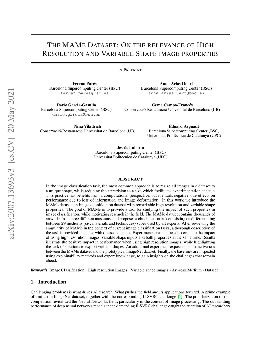 In the image classification task, the most common approach is to resize all images in a dataset to a unique shape, while reducing their precision to a size which facilitates experimentation at scale. This practice has benefits from a computational perspective, but it entails negative side-effects on performance due to loss of information and image deformation. In this work we introduce the MAMe dataset, an image classification dataset with remarkable high resolution and variable shape properties. The goal of MAMe is to provide a tool for studying the impact of such properties in image classification, while motivating research in the field. The MAMe dataset contains thousands of artworks from three different museums, and proposes a classification task consisting on differentiating between 29 mediums (i.e. materials and techniques) supervised by art experts. After reviewing the singularity of MAMe in the context of current image classification tasks, a thorough description of the task is provided, together with dataset statistics. Experiments are conducted to evaluate the impact of using high resolution images, variable shape inputs and both properties at the same time. Results illustrate the positive impact in performance when using high resolution images, while highlighting the lack of solutions to exploit variable shapes. An additional experiment exposes the distinctiveness between the MAMe dataset and the prototypical ImageNet dataset. Finally, the baselines are inspected using explainability methods and expert knowledge, to gain insights on the challenges that remain ahead.