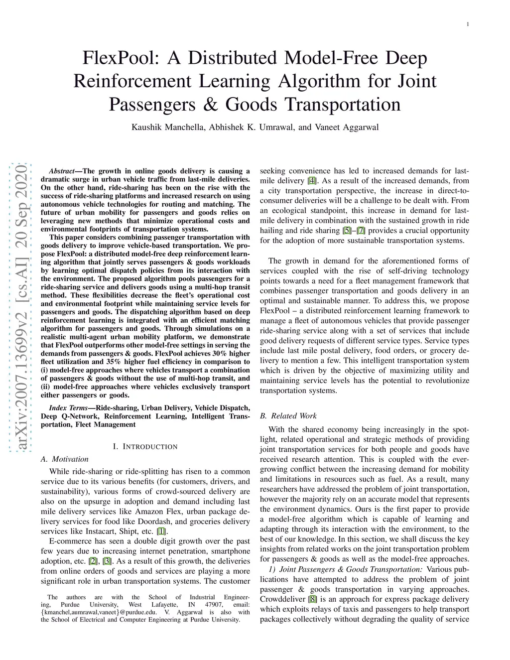 The growth in online goods delivery is causing a dramatic surge in urban vehicle traffic from last-mile deliveries. On the other hand, ride-sharing has been on the rise with the success of ride-sharing platforms and increased research on using autonomous vehicle technologies for routing and matching. The future of urban mobility for passengers and goods relies on leveraging new methods that minimize operational costs and environmental footprints of transportation systems. This paper considers combining passenger transportation with goods delivery to improve vehicle-based transportation. Even though the problem has been studied with a defined dynamics model of the transportation system environment, this paper considers a model-free approach that has been demonstrated to be adaptable to new or erratic environment dynamics. We propose FlexPool, a distributed model-free deep reinforcement learning algorithm that jointly serves passengers & goods workloads by learning optimal dispatch policies from its interaction with the environment. The proposed algorithm pools passengers for a ride-sharing service and delivers goods using a multi-hop transit method. These flexibilities decrease the fleet's operational cost and environmental footprint while maintaining service levels for passengers and goods. Through simulations on a realistic multi-agent urban mobility platform, we demonstrate that FlexPool outperforms other model-free settings in serving the demands from passengers & goods. FlexPool achieves 30% higher fleet utilization and 35% higher fuel efficiency in comparison to (i) model-free approaches where vehicles transport a combination of passengers & goods without the use of multi-hop transit, and (ii) model-free approaches where vehicles exclusively transport either passengers or goods.