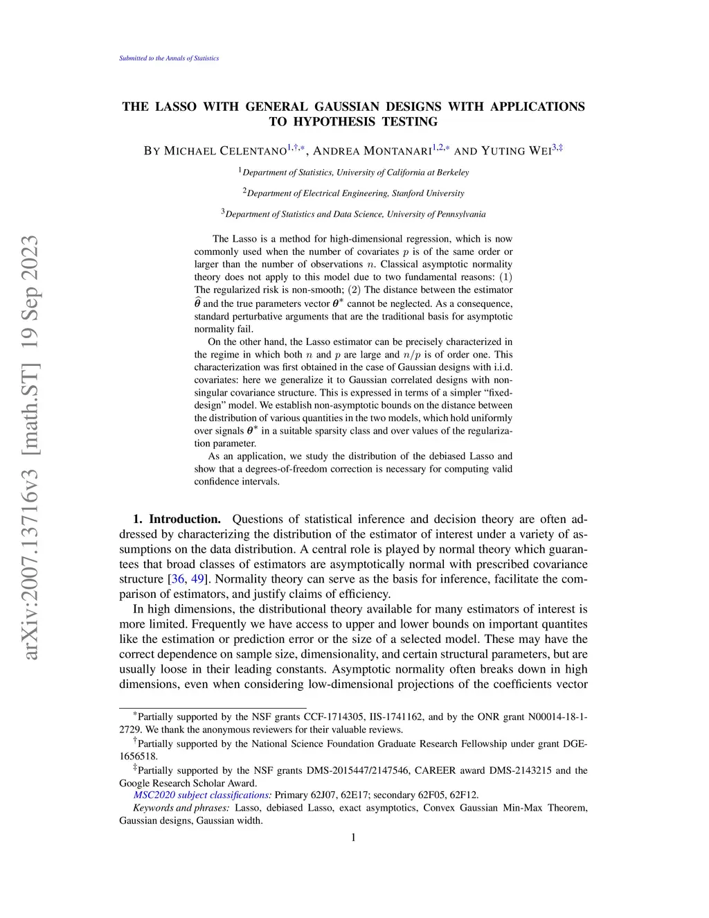 The Lasso is a method for high-dimensional regression, which is now commonly used when the number of covariates is of the same order or larger than the number of observations . Classical asymptotic normality theory does not apply to this model due to two fundamental reasons: The regularized risk is non-smooth; The distance between the estimator and the true parameters vector cannot be neglected. As a consequence, standard perturbative arguments that are the traditional basis for asymptotic normality fail. On the other hand, the Lasso estimator can be precisely characterized in the regime in which both and are large and is of order one. This characterization was first obtained in the case of Gaussian designs with i.i.d. covariates: here we generalize it to Gaussian correlated designs with non-singular covariance structure. This is expressed in terms of a simpler ``fixed-design'' model. We establish non-asymptotic bounds on the distance between the distribution of various quantities in the two models, which hold uniformly over signals in a suitable sparsity class and over values of the regularization parameter. As an application, we study the distribution of the debiased Lasso and show that a degrees-of-freedom correction is necessary for computing valid confidence intervals.
