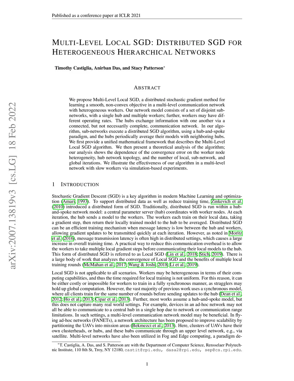 We propose Multi-Level Local SGD, a distributed gradient method for learning a smooth, non-convex objective in a heterogeneous multi-level network. Our network model consists of a set of disjoint sub-networks, with a single hub and multiple worker nodes; further, worker nodes may have different operating rates. The hubs exchange information with one another via a connected, but not necessarily complete communication network. In our algorithm, sub-networks execute a distributed SGD algorithm, using a hub-and-spoke paradigm, and the hubs periodically average their models with neighboring hubs. We first provide a unified mathematical framework that describes the Multi-Level Local SGD algorithm. We then present a theoretical analysis of the algorithm; our analysis shows the dependence of the convergence error on the worker node heterogeneity, hub network topology, and the number of local, sub-network, and global iterations. We back up our theoretical results via simulation-based experiments using both convex and non-convex objectives.