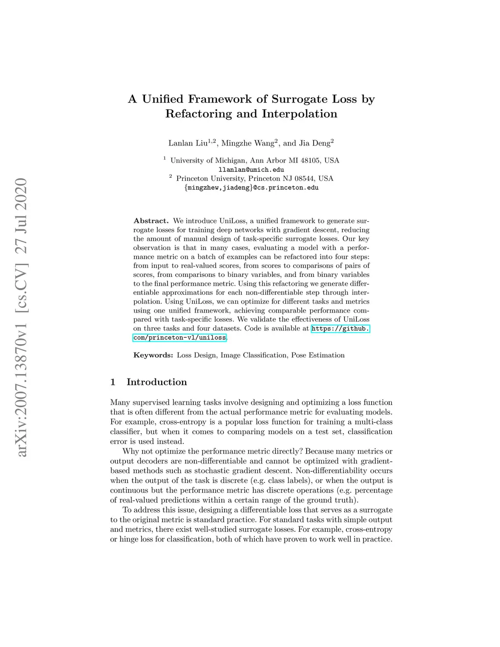We introduce UniLoss, a unified framework to generate surrogate losses for training deep networks with gradient descent, reducing the amount of manual design of task-specific surrogate losses. Our key observation is that in many cases, evaluating a model with a performance metric on a batch of examples can be refactored into four steps: from input to real-valued scores, from scores to comparisons of pairs of scores, from comparisons to binary variables, and from binary variables to the final performance metric. Using this refactoring we generate differentiable approximations for each non-differentiable step through interpolation. Using UniLoss, we can optimize for different tasks and metrics using one unified framework, achieving comparable performance compared with task-specific losses. We validate the effectiveness of UniLoss on three tasks and four datasets. Code is available at https://github.com/princeton-vl/uniloss.