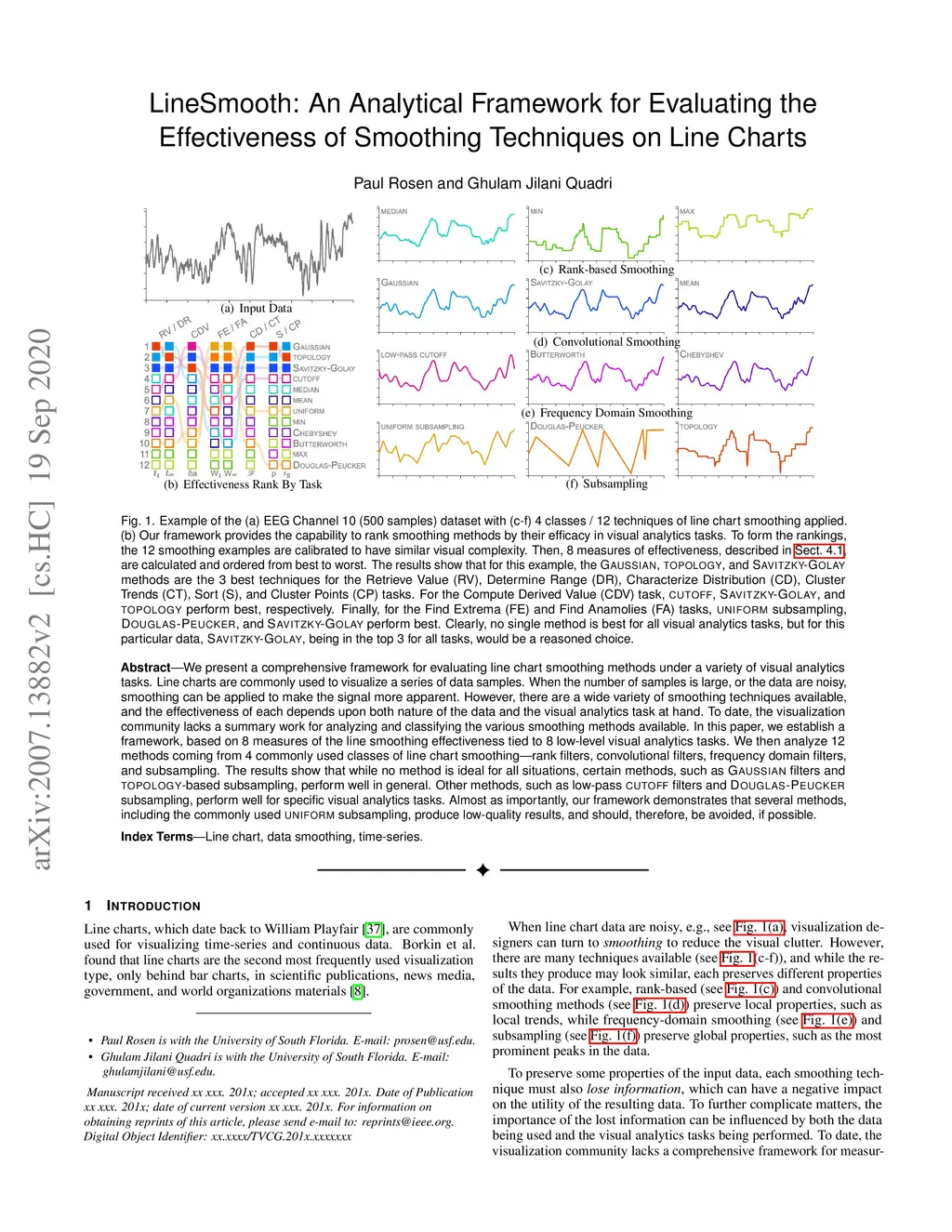 We present a comprehensive framework for evaluating line chart smoothing methods under a variety of visual analytics tasks. Line charts are commonly used to visualize a series of data samples. When the number of samples is large, or the data are noisy, smoothing can be applied to make the signal more apparent. However, there are a wide variety of smoothing techniques available, and the effectiveness of each depends upon both nature of the data and the visual analytics task at hand. To date, the visualization community lacks a summary work for analyzing and classifying the various smoothing methods available. In this paper, we establish a framework, based on 8 measures of the line smoothing effectiveness tied to 8 low-level visual analytics tasks. We then analyze 12 methods coming from 4 commonly used classes of line chart smoothing---rank filters, convolutional filters, frequency domain filters, and subsampling. The results show that while no method is ideal for all situations, certain methods, such as Gaussian filters and Topology-based subsampling, perform well in general. Other methods, such as low-pass cutoff filters and Douglas-Peucker subsampling, perform well for specific visual analytics tasks. Almost as importantly, our framework demonstrates that several methods, including the commonly used uniform subsampling, produce low-quality results, and should, therefore, be avoided, if possible.
