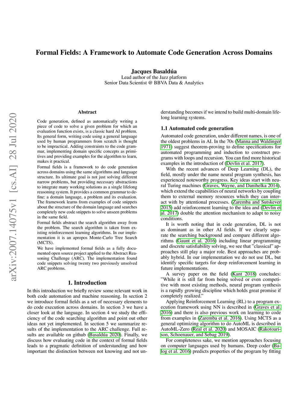 Code generation, defined as automatically writing a piece of code to solve a given problem for which an evaluation function exists, is a classic hard AI problem. Its general form, writing code using a general language used by human programmers from scratch is thought to be impractical. Adding constraints to the code grammar, implementing domain specific concepts as primitives and providing examples for the algorithm to learn, makes it practical. Formal fields is a framework to do code generation across domains using the same algorithms and language structure. Its ultimate goal is not just solving different narrow problems, but providing necessary abstractions to integrate many working solutions as a single lifelong reasoning system. It provides a common grammar to define: a domain language, a problem and its evaluation. The framework learns from examples of code snippets about the structure of the domain language and searches completely new code snippets to solve unseen problems in the same field. Formal fields abstract the search algorithm away from the problem. The search algorithm is taken from existing reinforcement learning algorithms. In our implementation it is an apropos Monte-Carlo Tree Search (MCTS). We have implemented formal fields as a fully documented open source project applied to the Abstract Reasoning Challenge (ARC). The implementation found code snippets solving twenty two previously unsolved ARC problems.