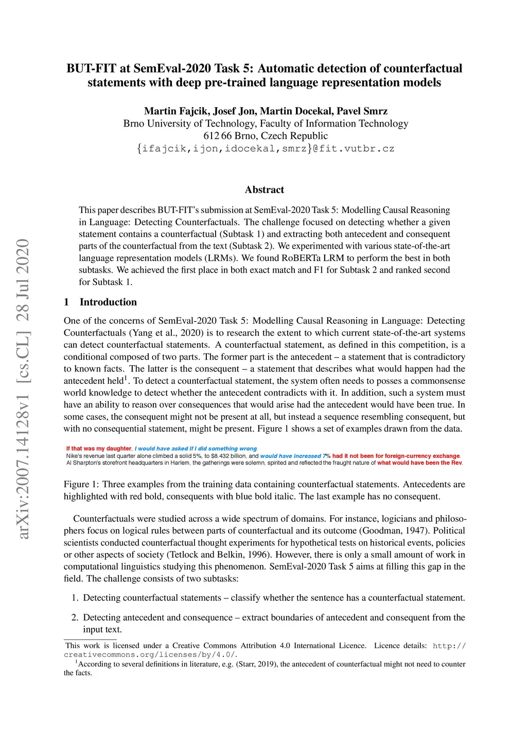 BUT-FIT at SemEval-2020 Task 5: Automatic detection of counterfactual