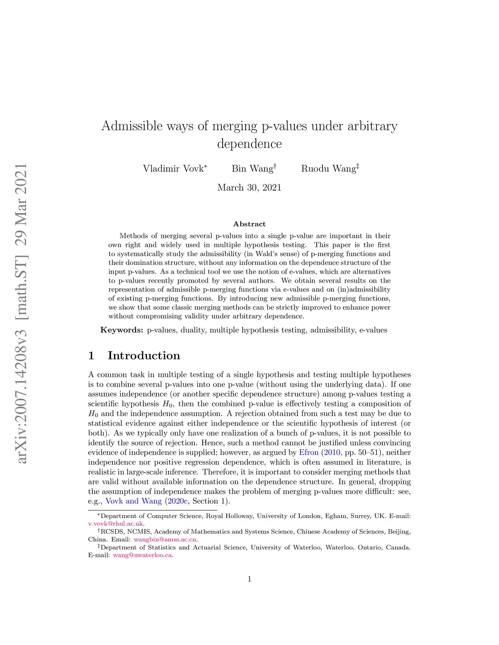 Methods of merging several p-values into a single p-value are important in their own right and widely used in multiple hypothesis testing. This paper is the first to systematically study the admissibility (in Wald's sense) of p-merging functions and their domination structure, without any information on the dependence structure of the input p-values. As a technical tool we use the notion of e-values, which are alternatives to p-values recently promoted by several authors. We obtain several results on the representation of admissible p-merging functions via e-values and on (in)admissibility of existing p-merging functions. By introducing new admissible p-merging functions, we show that some classic merging methods can be strictly improved to enhance power without compromising validity under arbitrary dependence.