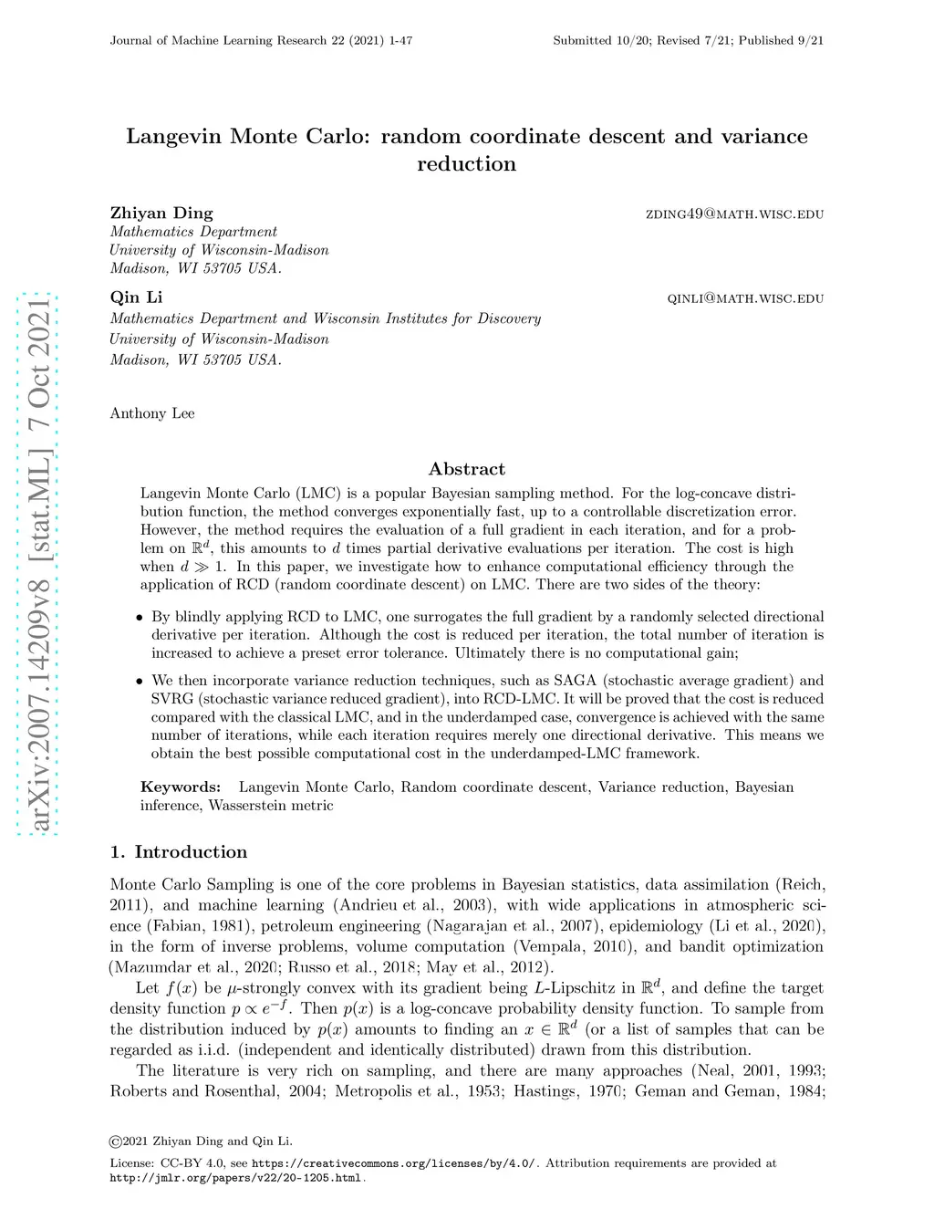 Langevin Monte Carlo (LMC) is a popular Bayesian sampling method. For the log-concave distribution function, the method converges exponentially fast, up to a controllable discretization error. However, the method requires the evaluation of a full gradient in each iteration, and for a problem on , this amounts to times partial derivative evaluations per iteration. The cost is high when . In this paper, we investigate how to enhance computational efficiency through the application of RCD (random coordinate descent) on LMC. There are two sides of the theory: 1 By blindly applying RCD to LMC, one surrogates the full gradient by a randomly selected directional derivative per iteration. Although the cost is reduced per iteration, the total number of iteration is increased to achieve a preset error tolerance. Ultimately there is no computational gain; 2 We then incorporate variance reduction techniques, such as SAGA (stochastic average gradient) and SVRG (stochastic variance reduced gradient), into RCD-LMC. It will be proved that the cost is reduced compared with the classical LMC, and in the underdamped case, convergence is achieved with the same number of iterations, while each iteration requires merely one-directional derivative. This means we obtain the best possible computational cost in the underdamped-LMC framework.