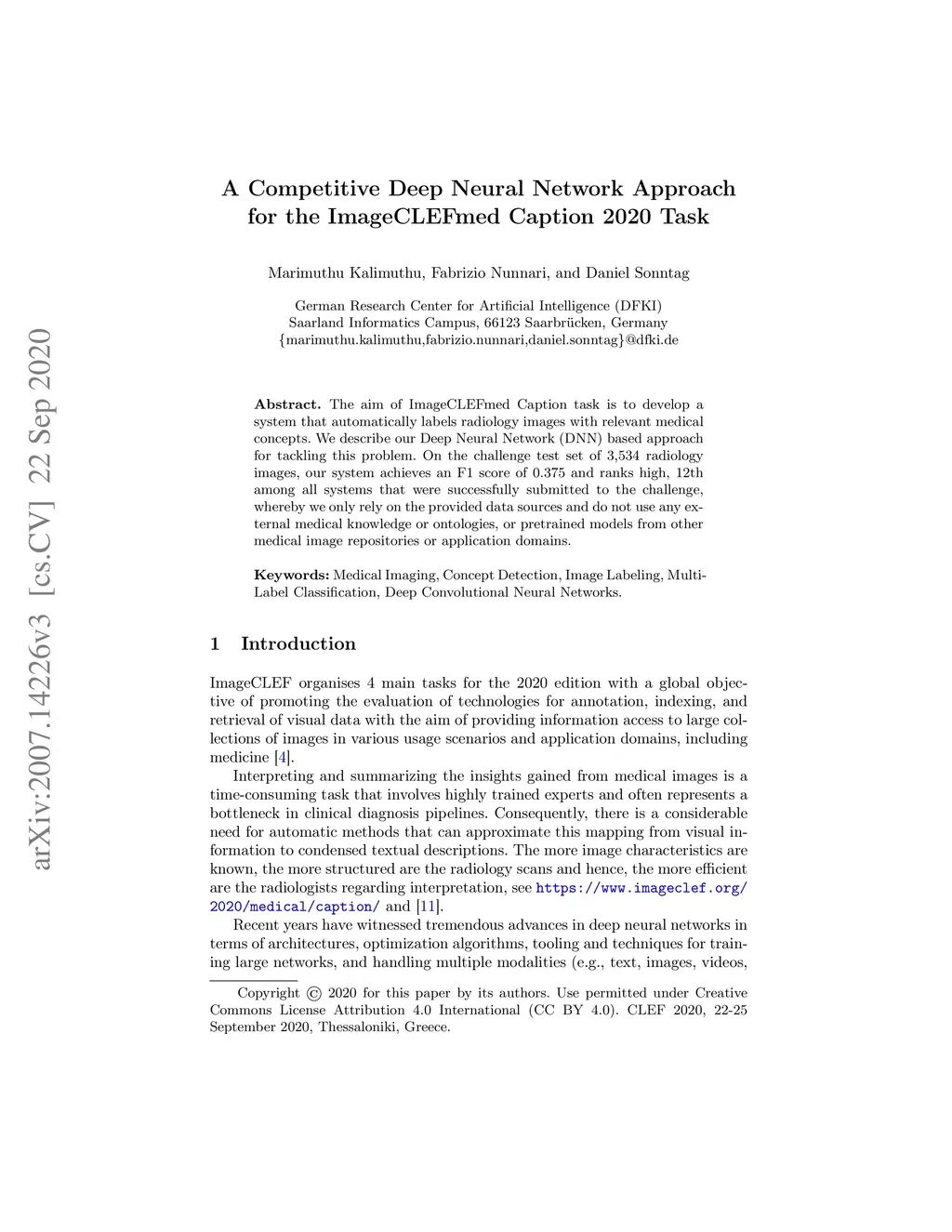 The aim of ImageCLEFmed Caption task is to develop a system that automatically labels radiology images with relevant medical concepts. We describe our Deep Neural Network (DNN) based approach for tackling this problem. On the challenge test set of 3,534 radiology images, our system achieves an F1 score of 0.375 and ranks high, 12th among all systems that were successfully submitted to the challenge, whereby we only rely on the provided data sources and do not use any external medical knowledge or ontologies, or pretrained models from other medical image repositories or application domains.