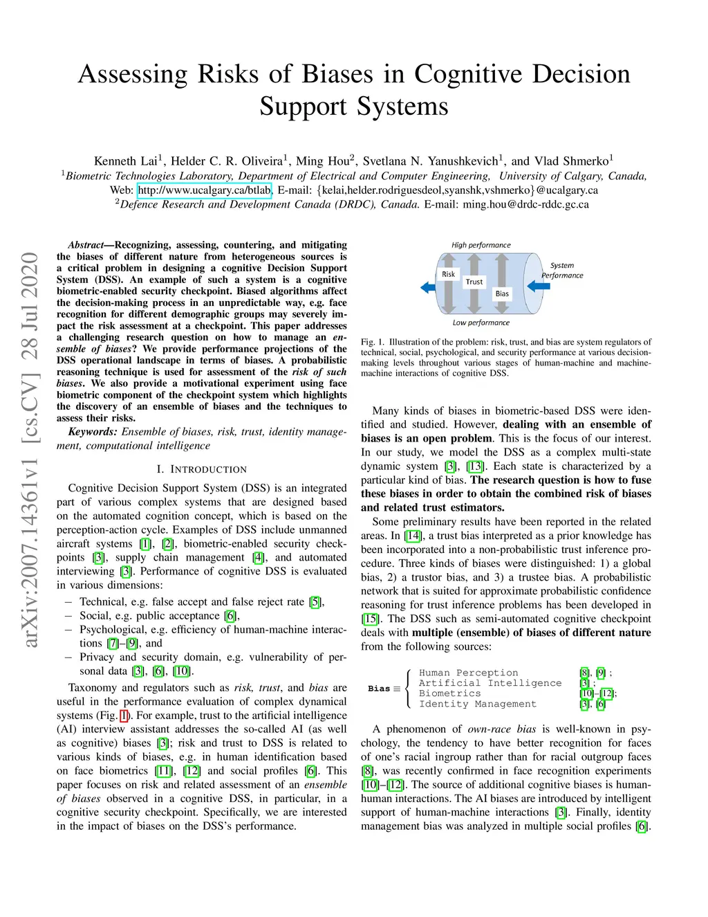 Recognizing, assessing, countering, and mitigating the biases of different nature from heterogeneous sources is a critical problem in designing a cognitive Decision Support System (DSS). An example of such a system is a cognitive biometric-enabled security checkpoint. Biased algorithms affect the decision-making process in an unpredictable way, e.g. face recognition for different demographic groups may severely impact the risk assessment at a checkpoint. This paper addresses a challenging research question on how to manage an ensemble of biases? We provide performance projections of the DSS operational landscape in terms of biases. A probabilistic reasoning technique is used for assessment of the risk of such biases. We also provide a motivational experiment using face biometric component of the checkpoint system which highlights the discovery of an ensemble of biases and the techniques to assess their risks.