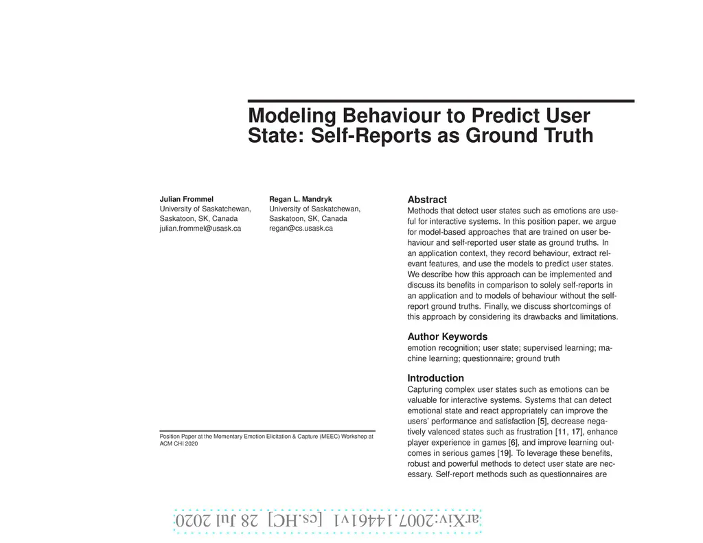 Methods that detect user states such as emotions are useful for interactive systems. In this position paper, we argue for model-based approaches that are trained on user behaviour and self-reported user state as ground truths. In an application context, they record behaviour, extract relevant features, and use the models to predict user states. We describe how this approach can be implemented and discuss its benefits in comparison to solely self-reports in an application and to models of behaviour without the selfreport ground truths. Finally, we discuss shortcomings of this approach by considering its drawbacks and limitations.
