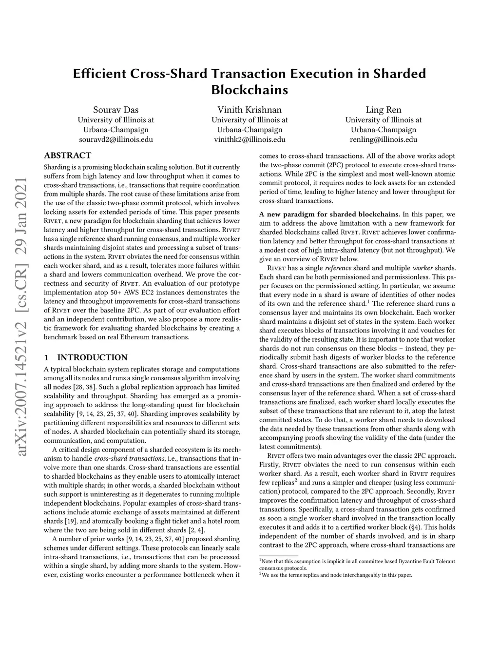 Sharding is a promising blockchain scaling solution. But it currently suffers from high latency and low throughput when it comes to cross-shard transactions, i.e., transactions that require coordination from multiple shards. The root cause of these limitations arise from the use of the classic two-phase commit protocol, which involves locking assets for extended periods of time. This paper presents Rivet, a new paradigm for blockchain sharding that achieves lower latency and higher throughput for cross-shard transactions. Rivet has a single reference shard running consensus, and multiple worker shards maintaining disjoint states and processing a subset of transactions in the system. Rivet obviates the need for consensus within each worker shard, and as a result, tolerates more failures within a shard and lowers communication overhead. We prove the correctness and security of Rivet. We also propose a more realistic framework for evaluating sharded blockchains by creating a benchmark based on real Ethereum transactions. An evaluation of our prototype implementation of Rivet and the baseline two-phase commit, atop 50+ AWS EC2 instances, using our evaluation framework demonstrates the latency and throughput improvements for cross-shard transactions.