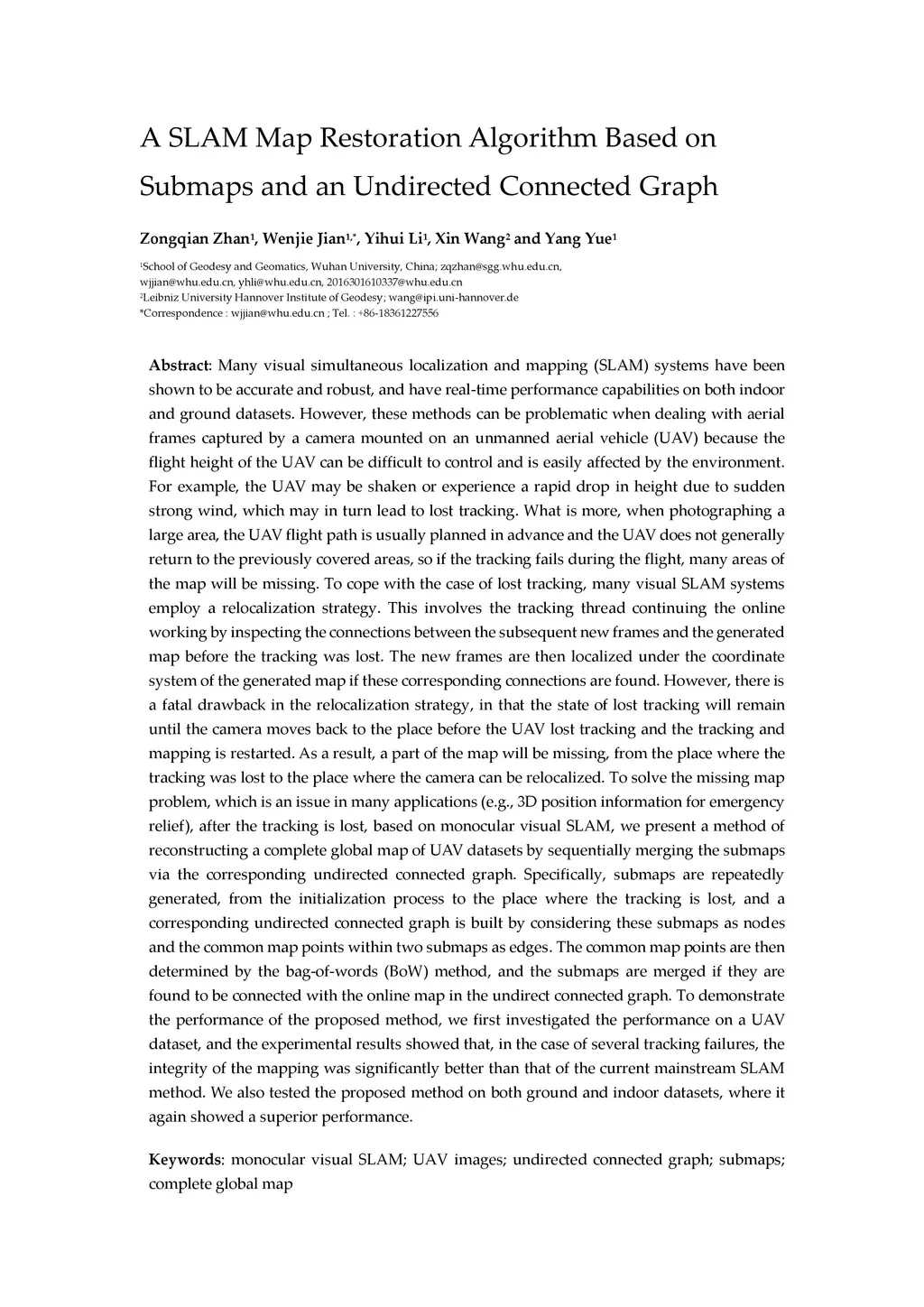 Many visual simultaneous localization and mapping (SLAM) systems have been shown to be accurate and robust, and have real-time performance capabilities on both indoor and ground datasets. However, these methods can be problematic when dealing with aerial frames captured by a camera mounted on an unmanned aerial vehicle (UAV) because the flight height of the UAV can be difficult to control and is easily affected by the environment.To cope with the case of lost tracking, many visual SLAM systems employ a relocalization strategy. This involves the tracking thread continuing the online working by inspecting the connections between the subsequent new frames and the generated map before the tracking was lost. To solve the missing map problem, which is an issue in many applications , after the tracking is lost, based on monocular visual SLAM, we present a method of reconstructing a complete global map of UAV datasets by sequentially merging the submaps via the corresponding undirected connected graph. Specifically, submaps are repeatedly generated, from the initialization process to the place where the tracking is lost, and a corresponding undirected connected graph is built by considering these submaps as nodes and the common map points within two submaps as edges. The common map points are then determined by the bag-of-words (BoW) method, and the submaps are merged if they are found to be connected with the online map in the undirect connected graph. To demonstrate the performance of the proposed method, we first investigated the performance on a UAV dataset, and the experimental results showed that, in the case of several tracking failures, the integrity of the mapping was significantly better than that of the current mainstream SLAM method.