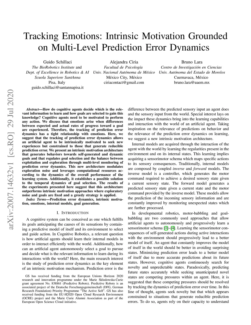 How do cognitive agents decide what is the relevant information to learn and how goals are selected to gain this knowledge? Cognitive agents need to be motivated to perform any action. We discuss that emotions arise when differences between expected and actual rates of progress towards a goal are experienced. Therefore, the tracking of prediction error dynamics has a tight relationship with emotions. Here, we suggest that the tracking of prediction error dynamics allows an artificial agent to be intrinsically motivated to seek new experiences but constrained to those that generate reducible prediction error.We present an intrinsic motivation architecture that generates behaviors towards self-generated and dynamic goals and that regulates goal selection and the balance between exploitation and exploration through multi-level monitoring of prediction error dynamics. This new architecture modulates exploration noise and leverages computational resources according to the dynamics of the overall performance of the learning system. Additionally, it establishes a possible solution to the temporal dynamics of goal selection. The results of the experiments presented here suggest that this architecture outperforms intrinsic motivation approaches where exploratory noise and goals are fixed and a greedy strategy is applied.