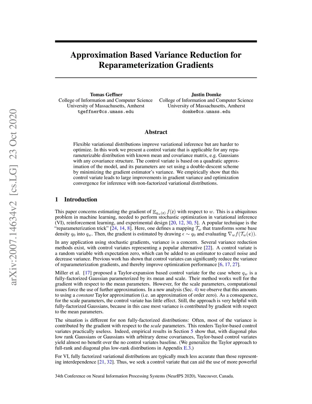 Approximation Based Variance Reduction for Reparameterization Gradients
