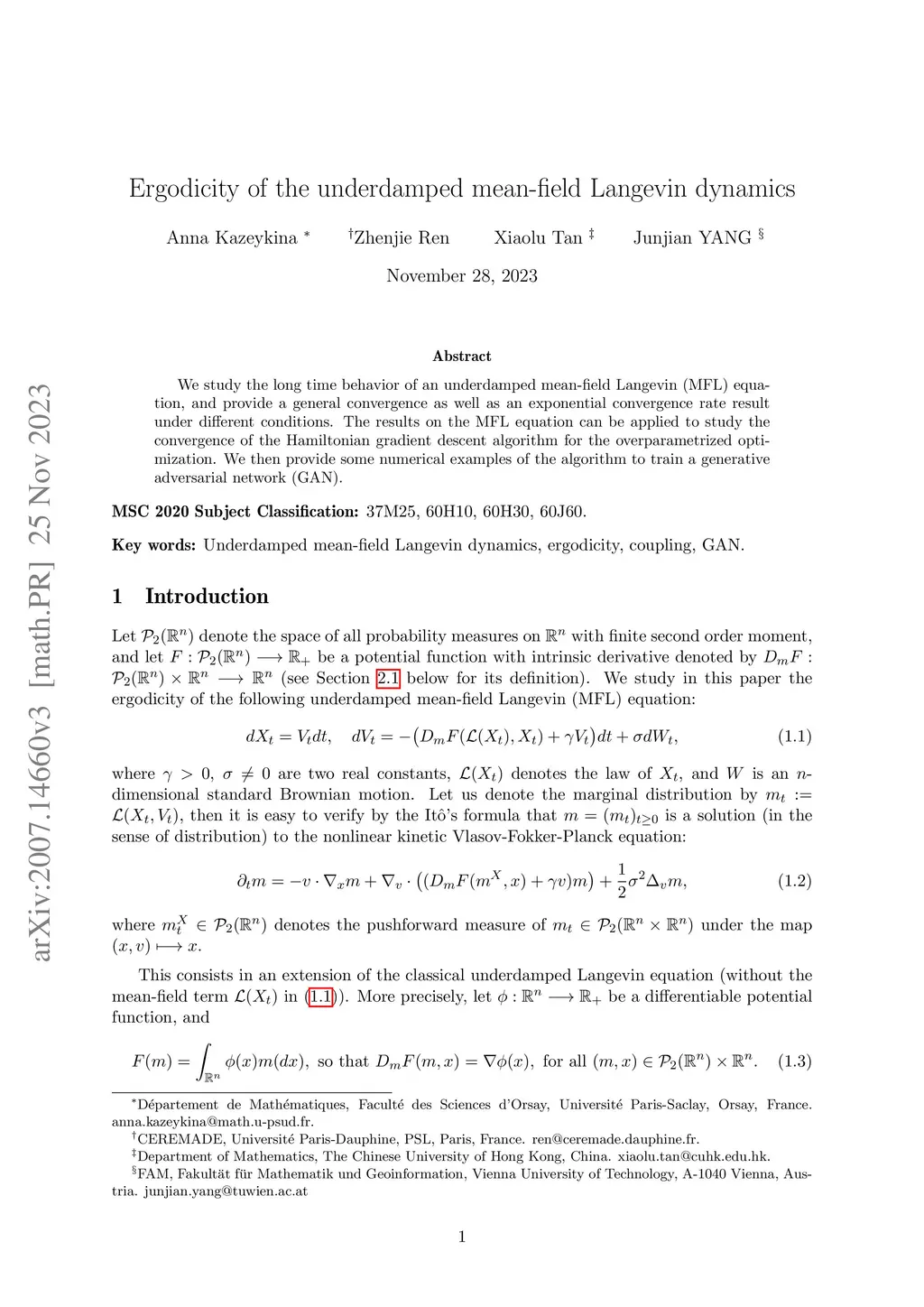 We study the long time behavior of an underdamped mean-field Langevin (MFL) equation, and provide a general convergence as well as an exponential convergence rate result under different conditions. The results on the MFL equation can be applied to study the convergence of the Hamiltonian gradient descent algorithm for the overparametrized optimization. We then provide a numerical example of the algorithm to train a generative adversarial networks (GAN).