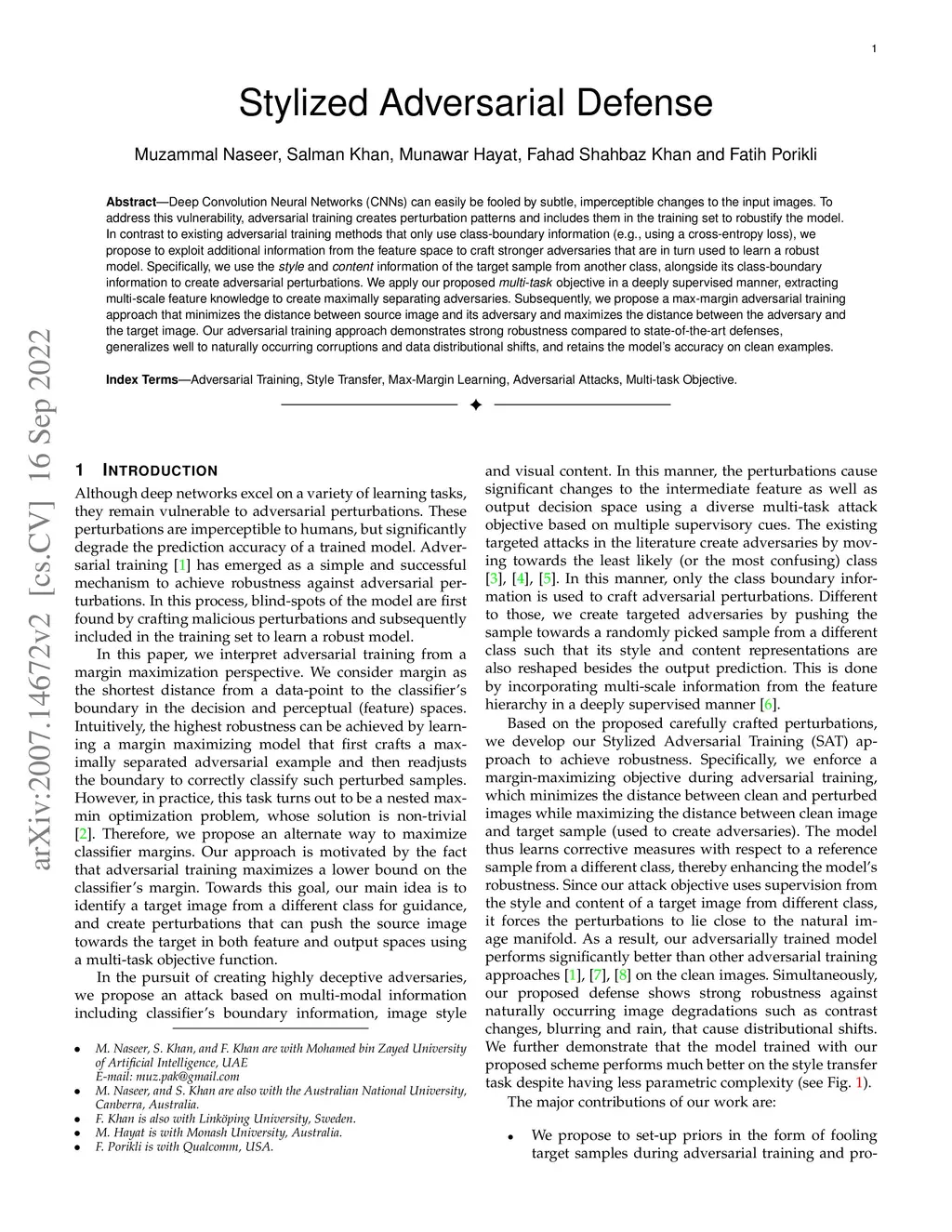 Deep Convolution Neural Networks (CNNs) can easily be fooled by subtle, imperceptible changes to the input images. To address this vulnerability, adversarial training creates perturbation patterns and includes them in the training set to robustify the model. In contrast to existing adversarial training methods that only use class-boundary information (e.g., using a cross-entropy loss), we propose to exploit additional information from the feature space to craft stronger adversaries that are in turn used to learn a robust model. Specifically, we use the style and content information of the target sample from another class, alongside its class-boundary information to create adversarial perturbations. We apply our proposed multi-task objective in a deeply supervised manner, extracting multi-scale feature knowledge to create maximally separating adversaries. Subsequently, we propose a max-margin adversarial training approach that minimizes the distance between source image and its adversary and maximizes the distance between the adversary and the target image. Our adversarial training approach demonstrates strong robustness compared to state-of-the-art defenses, generalizes well to naturally occurring corruptions and data distributional shifts, and retains the model accuracy on clean examples.
