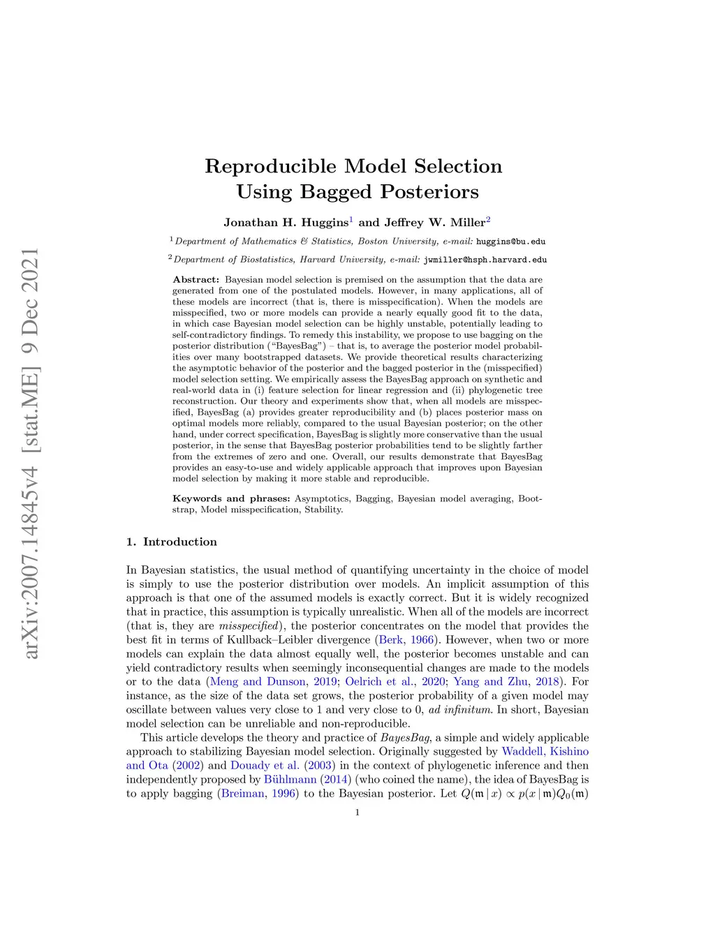 Bayesian model selection is premised on the assumption that the data are generated from one of the postulated models. However, in many applications, all of these models are incorrect (that is, there is misspecification). When the models are misspecified, two or more models can provide a nearly equally good fit to the data, in which case Bayesian model selection can be highly unstable, potentially leading to self-contradictory findings. To remedy this instability, we propose to use bagging on the posterior distribution ("BayesBag") -- that is, to average the posterior model probabilities over many bootstrapped datasets. We provide theoretical results characterizing the asymptotic behavior of the posterior and the bagged posterior in the (misspecified) model selection setting. We empirically assess the BayesBag approach on synthetic and real-world data in (i) feature selection for linear regression and (ii) phylogenetic tree reconstruction. Our theory and experiments show that, when all models are misspecified, BayesBag (a) provides greater reproducibility and (b) places posterior mass on optimal models more reliably, compared to the usual Bayesian posterior; on the other hand, under correct specification, BayesBag is slightly more conservative than the usual posterior, in the sense that BayesBag posterior probabilities tend to be slightly farther from the extremes of zero and one. Overall, our results demonstrate that BayesBag provides an easy-to-use and widely applicable approach that improves upon Bayesian model selection by making it more stable and reproducible.