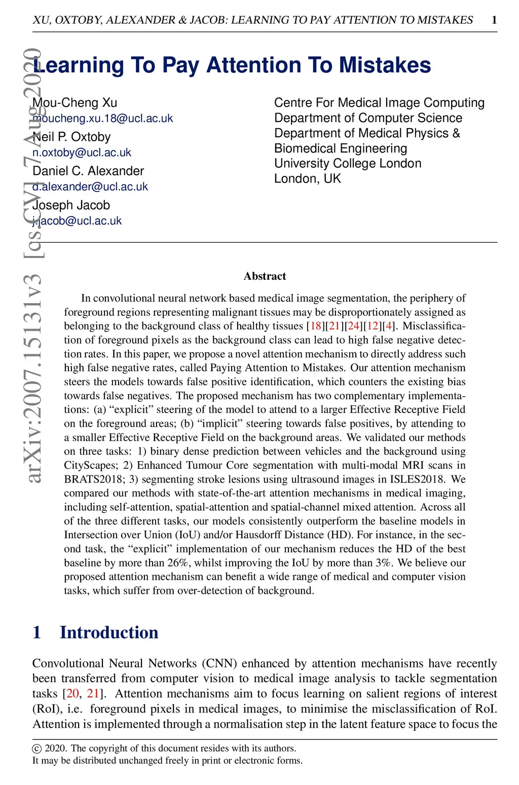 In convolutional neural network based medical image segmentation, the periphery of foreground regions representing malignant tissues may be disproportionately assigned as belonging to the background class of healthy tissues \cite{attenUnet}\cite{AttenUnet2018}\cite{InterSeg}\cite{UnetFrontNeuro}\cite{LearnActiveContour}. This leads to high false negative detection rates. In this paper, we propose a novel attention mechanism to directly address such high false negative rates, called Paying Attention to Mistakes. Our attention mechanism steers the models towards false positive identification, which counters the existing bias towards false negatives. The proposed mechanism has two complementary implementations: (a) "explicit" steering of the model to attend to a larger Effective Receptive Field on the foreground areas; (b) "implicit" steering towards false positives, by attending to a smaller Effective Receptive Field on the background areas. We validated our methods on three tasks: 1) binary dense prediction between vehicles and the background using CityScapes; 2) Enhanced Tumour Core segmentation with multi-modal MRI scans in BRATS2018; 3) segmenting stroke lesions using ultrasound images in ISLES2018. We compared our methods with state-of-the-art attention mechanisms in medical imaging, including self-attention, spatial-attention and spatial-channel mixed attention. Across all of the three different tasks, our models consistently outperform the baseline models in Intersection over Union (IoU) and/or Hausdorff Distance (HD). For instance, in the second task, the "explicit" implementation of our mechanism reduces the HD of the best baseline by more than , whilst improving the IoU by more than . We believe our proposed attention mechanism can benefit a wide range of medical and computer vision tasks, which suffer from over-detection of background.