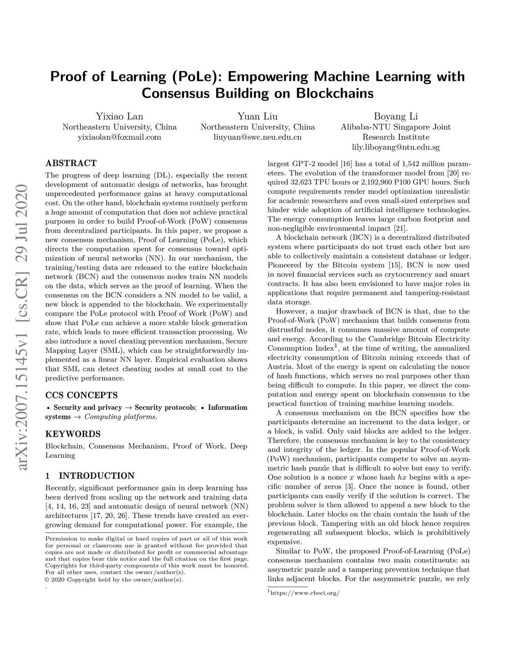 The progress of deep learning (DL), especially the recent development of automatic design of networks, has brought unprecedented performance gains at heavy computational cost. On the other hand, blockchain systems routinely perform a huge amount of computation that does not achieve practical purposes in order to build Proof-of-Work (PoW) consensus from decentralized participants. In this paper, we propose a new consensus mechanism, Proof of Learning (PoLe), which directs the computation spent for consensus toward optimization of neural networks (NN). In our mechanism, the training/testing data are released to the entire blockchain network (BCN) and the consensus nodes train NN models on the data, which serves as the proof of learning. When the consensus on the BCN considers a NN model to be valid, a new block is appended to the blockchain. We experimentally compare the PoLe protocol with Proof of Work (PoW) and show that PoLe can achieve a more stable block generation rate, which leads to more efficient transaction processing. We also introduce a novel cheating prevention mechanism, Secure Mapping Layer (SML), which can be straightforwardly implemented as a linear NN layer. Empirical evaluation shows that SML can detect cheating nodes at small cost to the predictive performance.