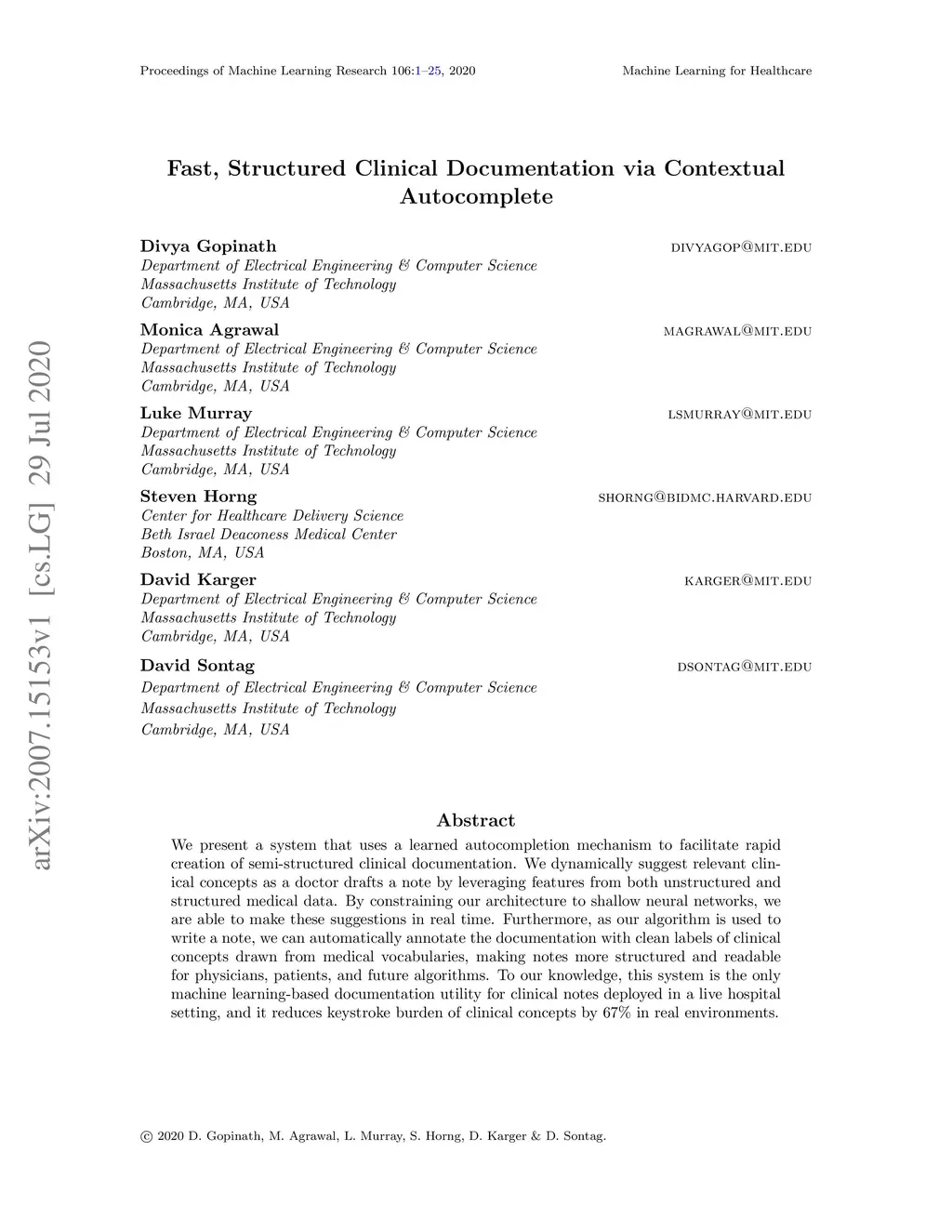 We present a system that uses a learned autocompletion mechanism to facilitate rapid creation of semi-structured clinical documentation. We dynamically suggest relevant clinical concepts as a doctor drafts a note by leveraging features from both unstructured and structured medical data. By constraining our architecture to shallow neural networks, we are able to make these suggestions in real time. Furthermore, as our algorithm is used to write a note, we can automatically annotate the documentation with clean labels of clinical concepts drawn from medical vocabularies, making notes more structured and readable for physicians, patients, and future algorithms. To our knowledge, this system is the only machine learning-based documentation utility for clinical notes deployed in a live hospital setting, and it reduces keystroke burden of clinical concepts by 67% in real environments.