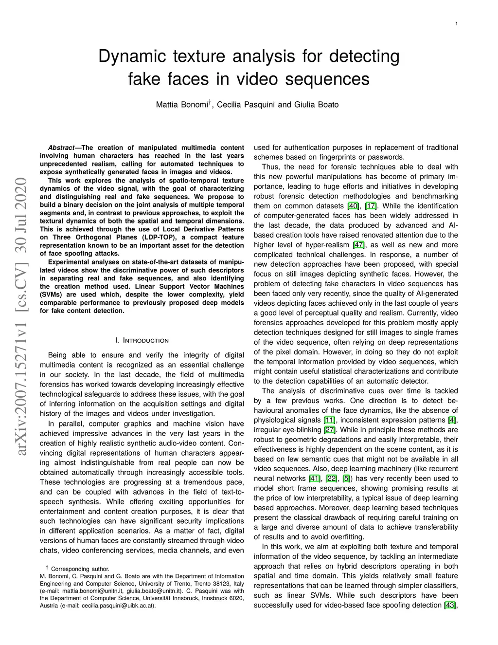 The creation of manipulated multimedia content involving human characters has reached in the last years unprecedented realism, calling for automated techniques to expose synthetically generated faces in images and videos. This work explores the analysis of spatio-temporal texture dynamics of the video signal, with the goal of characterizing and distinguishing real and fake sequences. We propose to build a binary decision on the joint analysis of multiple temporal segments and, in contrast to previous approaches, to exploit the textural dynamics of both the spatial and temporal dimensions. This is achieved through the use of Local Derivative Patterns on Three Orthogonal Planes (LDP-TOP), a compact feature representation known to be an important asset for the detection of face spoofing attacks. Experimental analyses on state-of-the-art datasets of manipulated videos show the discriminative power of such descriptors in separating real and fake sequences, and also identifying the creation method used. Linear Support Vector Machines (SVMs) are used which, despite the lower complexity, yield comparable performance to previously proposed deep models for fake content detection.
