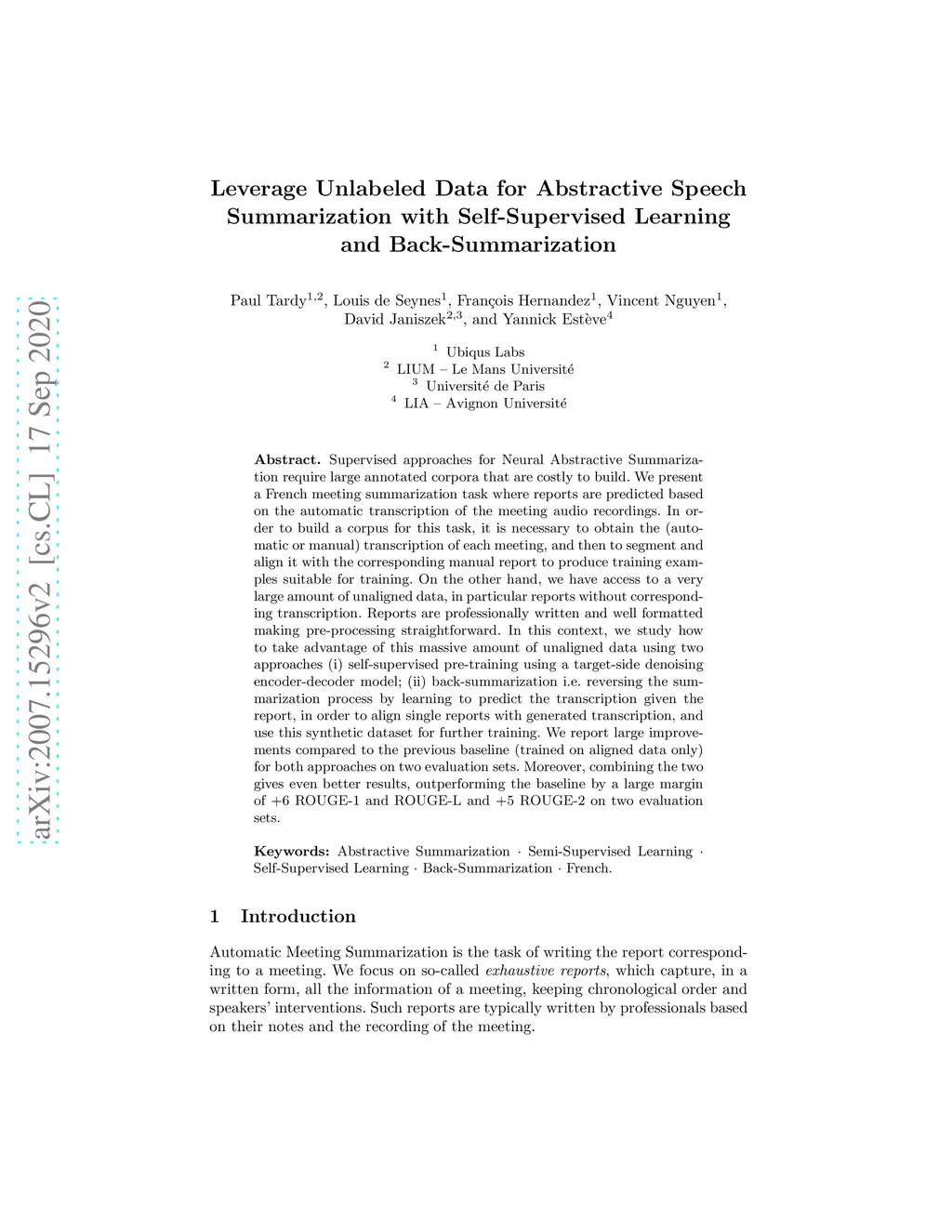 Supervised approaches for Neural Abstractive Summarization require large annotated corpora that are costly to build. We present a French meeting summarization task where reports are predicted based on the automatic transcription of the meeting audio recordings. In order to build a corpus for this task, it is necessary to obtain the (automatic or manual) transcription of each meeting, and then to segment and align it with the corresponding manual report to produce training examples suitable for training. On the other hand, we have access to a very large amount of unaligned data, in particular reports without corresponding transcription. Reports are professionally written and well formatted making pre-processing straightforward. In this context, we study how to take advantage of this massive amount of unaligned data using two approaches (i) self-supervised pre-training using a target-side denoising encoder-decoder model; (ii) back-summarization i.e. reversing the summarization process by learning to predict the transcription given the report, in order to align single reports with generated transcription, and use this synthetic dataset for further training. We report large improvements compared to the previous baseline (trained on aligned data only) for both approaches on two evaluation sets. Moreover, combining the two gives even better results, outperforming the baseline by a large margin of +6 ROUGE-1 and ROUGE-L and +5 ROUGE-2 on two evaluation sets