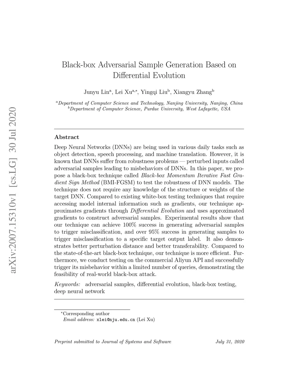 Black-box Adversarial Sample Generation Based on Differential Evolution