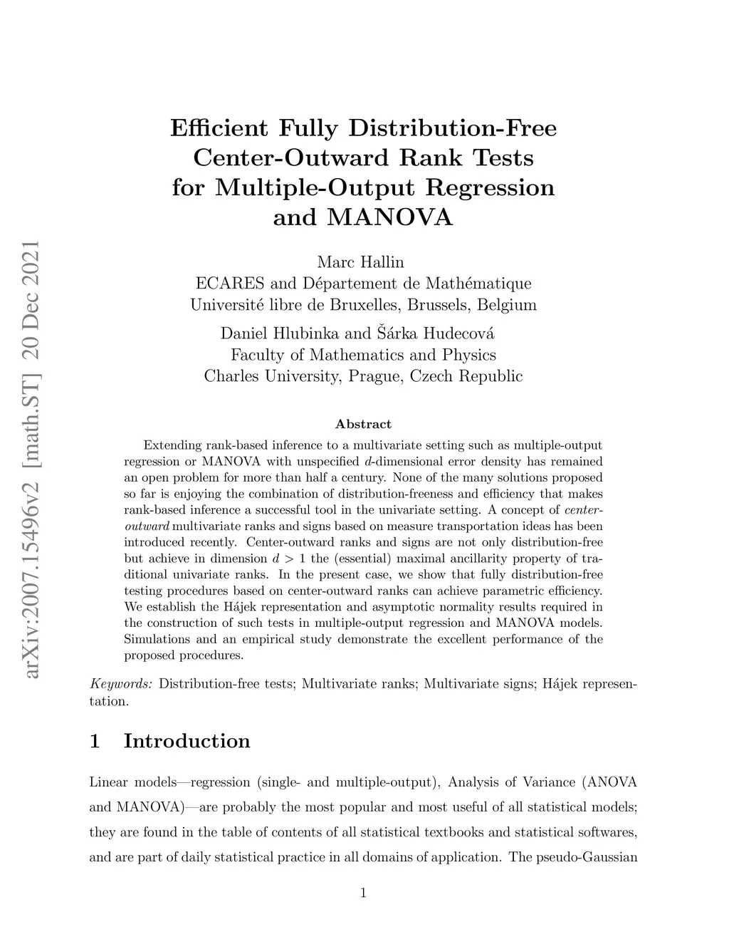 Extending rank-based inference to a multivariate setting such as multiple-output regression or MANOVA with unspecified d-dimensional error density has remained an open problem for more than half a century. None of the many solutions proposed so far is enjoying the combination of distribution-freeness and efficiency that makes rank-based inference a successful tool in the univariate setting. A concept of center-outward multivariate ranks and signs based on measure transportation ideas has been introduced recently. Center-outward ranks and signs are not only distribution-free but achieve in dimension d > 1 the (essential) maximal ancillarity property of traditional univariate ranks, hence carry all the "distribution-free information" available in the sample. We derive here the H\ájek representation and asymptotic normality results required in the construction of center-outward rank tests for multiple-output regression and MANOVA. When based on appropriate spherical scores, these fully distribution-free tests achieve parametric efficiency in the corresponding models.