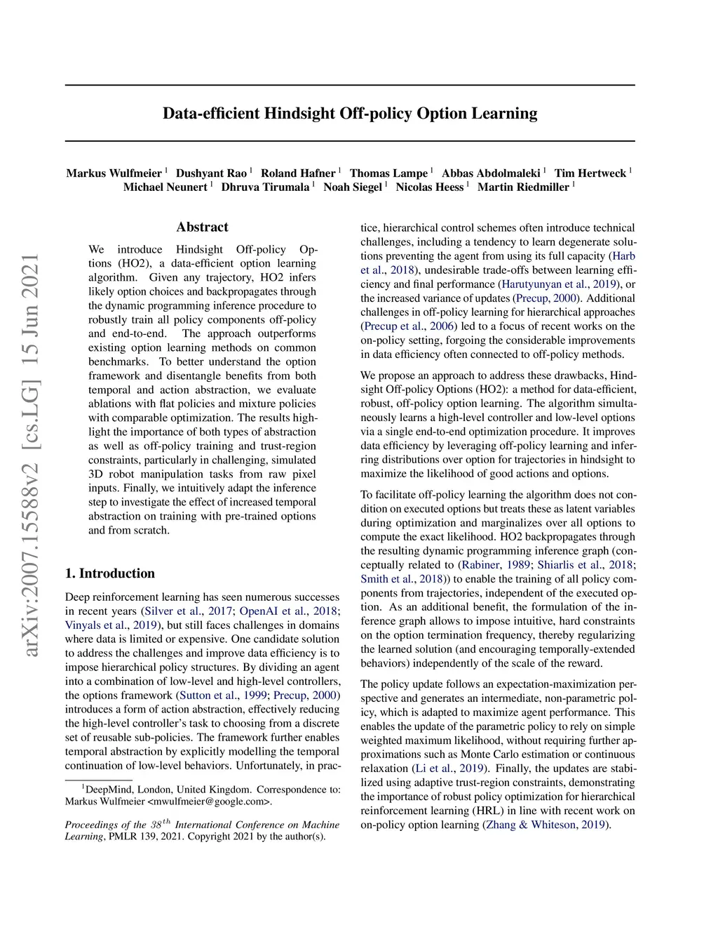 We introduce Hindsight Off-policy Options (HO2), a data-efficient option learning algorithm. Given any trajectory, HO2 infers likely option choices and backpropagates through the dynamic programming inference procedure to robustly train all policy components off-policy and end-to-end. The approach outperforms existing option learning methods on common benchmarks. To better understand the option framework and disentangle benefits from both temporal and action abstraction, we evaluate ablations with flat policies and mixture policies with comparable optimization. The results highlight the importance of both types of abstraction as well as off-policy training and trust-region constraints, particularly in challenging, simulated 3D robot manipulation tasks from raw pixel inputs. Finally, we intuitively adapt the inference step to investigate the effect of increased temporal abstraction on training with pre-trained options and from scratch.