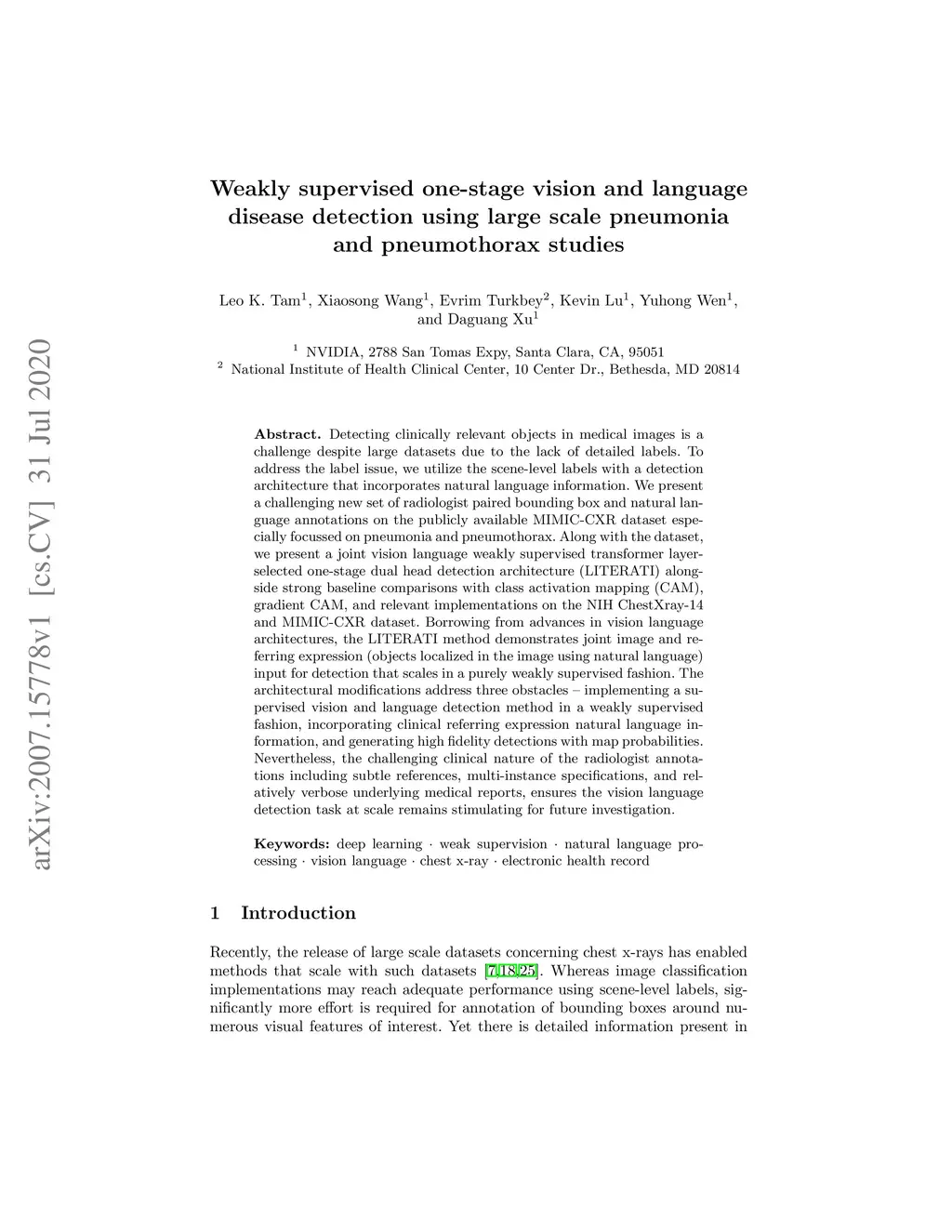 Detecting clinically relevant objects in medical images is a challenge despite large datasets due to the lack of detailed labels. To address the label issue, we utilize the scene-level labels with a detection architecture that incorporates natural language information. We present a challenging new set of radiologist paired bounding box and natural language annotations on the publicly available MIMIC-CXR dataset especially focussed on pneumonia and pneumothorax. Along with the dataset, we present a joint vision language weakly supervised transformer layer-selected one-stage dual head detection architecture (LITERATI) alongside strong baseline comparisons with class activation mapping (CAM), gradient CAM, and relevant implementations on the NIH ChestXray-14 and MIMIC-CXR dataset. Borrowing from advances in vision language architectures, the LITERATI method demonstrates joint image and referring expression (objects localized in the image using natural language) input for detection that scales in a purely weakly supervised fashion. The architectural modifications address three obstacles -- implementing a supervised vision and language detection method in a weakly supervised fashion, incorporating clinical referring expression natural language information, and generating high fidelity detections with map probabilities. Nevertheless, the challenging clinical nature of the radiologist annotations including subtle references, multi-instance specifications, and relatively verbose underlying medical reports, ensures the vision language detection task at scale remains stimulating for future investigation.