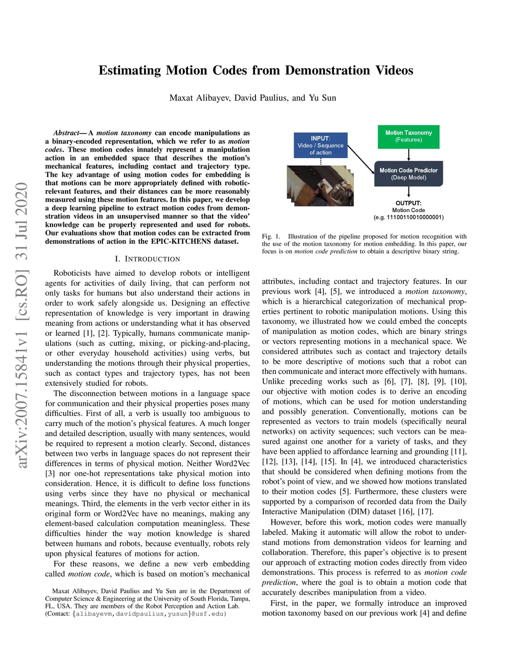 A motion taxonomy can encode manipulations as a binary-encoded representation, which we refer to as motion codes. These motion codes innately represent a manipulation action in an embedded space that describes the motion's mechanical features, including contact and trajectory type. The key advantage of using motion codes for embedding is that motions can be more appropriately defined with robotic-relevant features, and their distances can be more reasonably measured using these motion features. In this paper, we develop a deep learning pipeline to extract motion codes from demonstration videos in an unsupervised manner so that knowledge from these videos can be properly represented and used for robots. Our evaluations show that motion codes can be extracted from demonstrations of action in the EPIC-KITCHENS dataset.