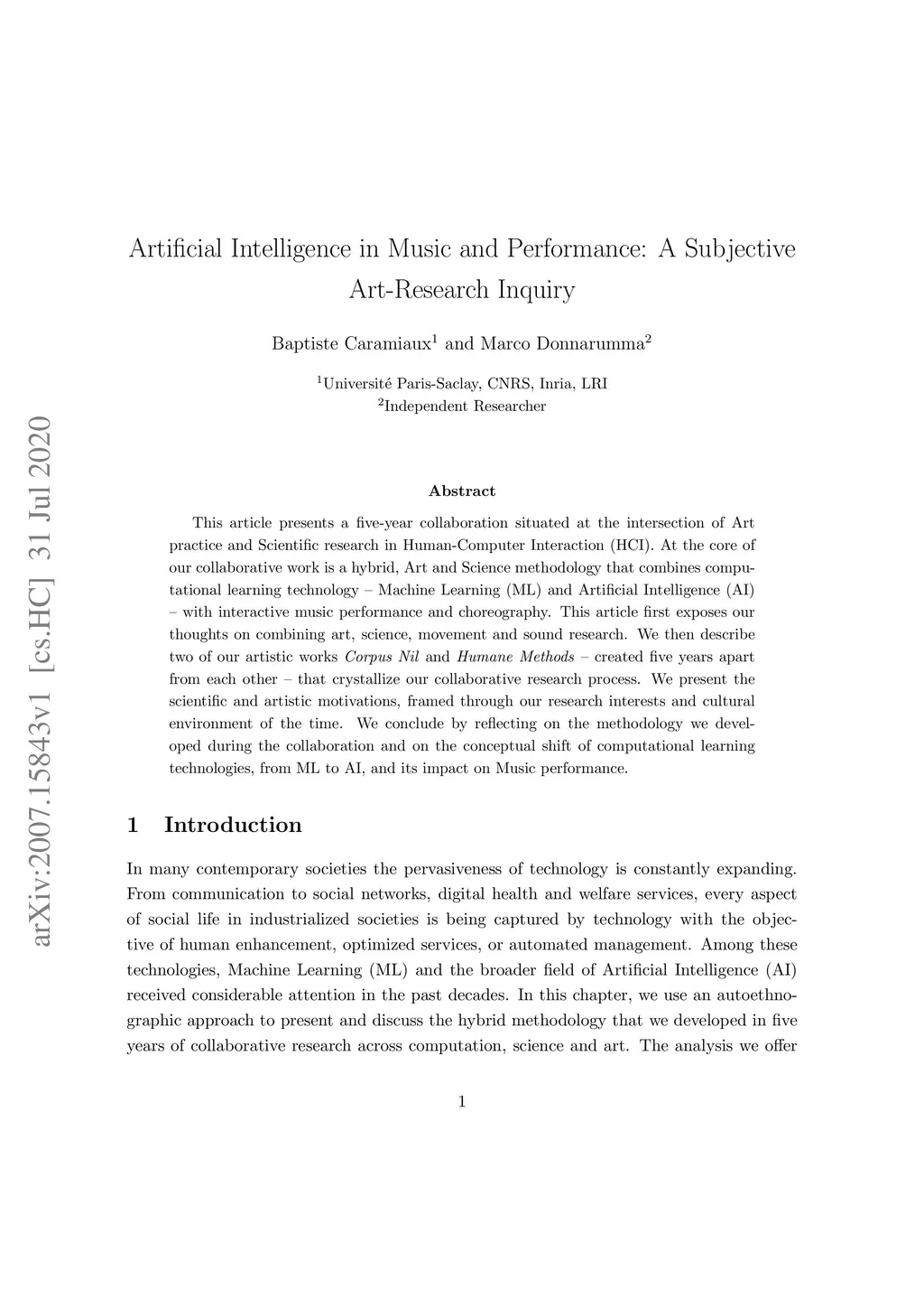 This article presents a five-year collaboration situated at the intersection of Art practice and Scientific research in Human-Computer Interaction (HCI). At the core of our collaborative work is a hybrid, Art and Science methodology that combines computational learning technology -- Machine Learning (ML) and Artificial Intelligence (AI) -- with interactive music performance and choreography. This article first exposes our thoughts on combining art, science, movement and sound research. We then describe two of our artistic works \textit{Corpus Nil} and \textit{Humane Methods} -- created five years apart from each other -- that crystallize our collaborative research process. We present the scientific and artistic motivations, framed through our research interests and cultural environment of the time. We conclude by reflecting on the methodology we developed during the collaboration and on the conceptual shift of computational learning technologies, from ML to AI, and its impact on Music performance.
