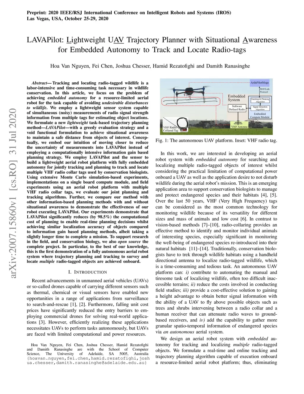 Tracking and locating radio-tagged wildlife is a labor-intensive and time-consuming task necessary in wildlife conservation. In this article, we focus on the problem of achieving embedded autonomy for a resource-limited aerial robot for the task capable of avoiding undesirable disturbances to wildlife. We employ a lightweight sensor system capable of simultaneous (noisy) measurements of radio signal strength information from multiple tags for estimating object locations. We formulate a new lightweight task-based trajectory planning method-LAVAPilot-with a greedy evaluation strategy and a void functional formulation to achieve situational awareness to maintain a safe distance from objects of interest. Conceptually, we embed our intuition of moving closer to reduce the uncertainty of measurements into LAVAPilot instead of employing a computationally intensive information gain based planning strategy. We employ LAVAPilot and the sensor to build a lightweight aerial robot platform with fully embedded autonomy for jointly tracking and planning to track and locate multiple VHF radio collar tags used by conservation biologists. Using extensive Monte Carlo simulation-based experiments, implementations on a single board compute module, and field experiments using an aerial robot platform with multiple VHF radio collar tags, we evaluate our joint planning and tracking algorithms. Further, we compare our method with other information-based planning methods with and without situational awareness to demonstrate the effectiveness of our robot executing LAVAPilot. Our experiments demonstrate that LAVAPilot significantly reduces (by 98.5%) the computational cost of planning to enable real-time planning decisions whilst achieving similar localization accuracy of objects compared to information gain based planning methods, albeit taking a slightly longer time to complete a mission.