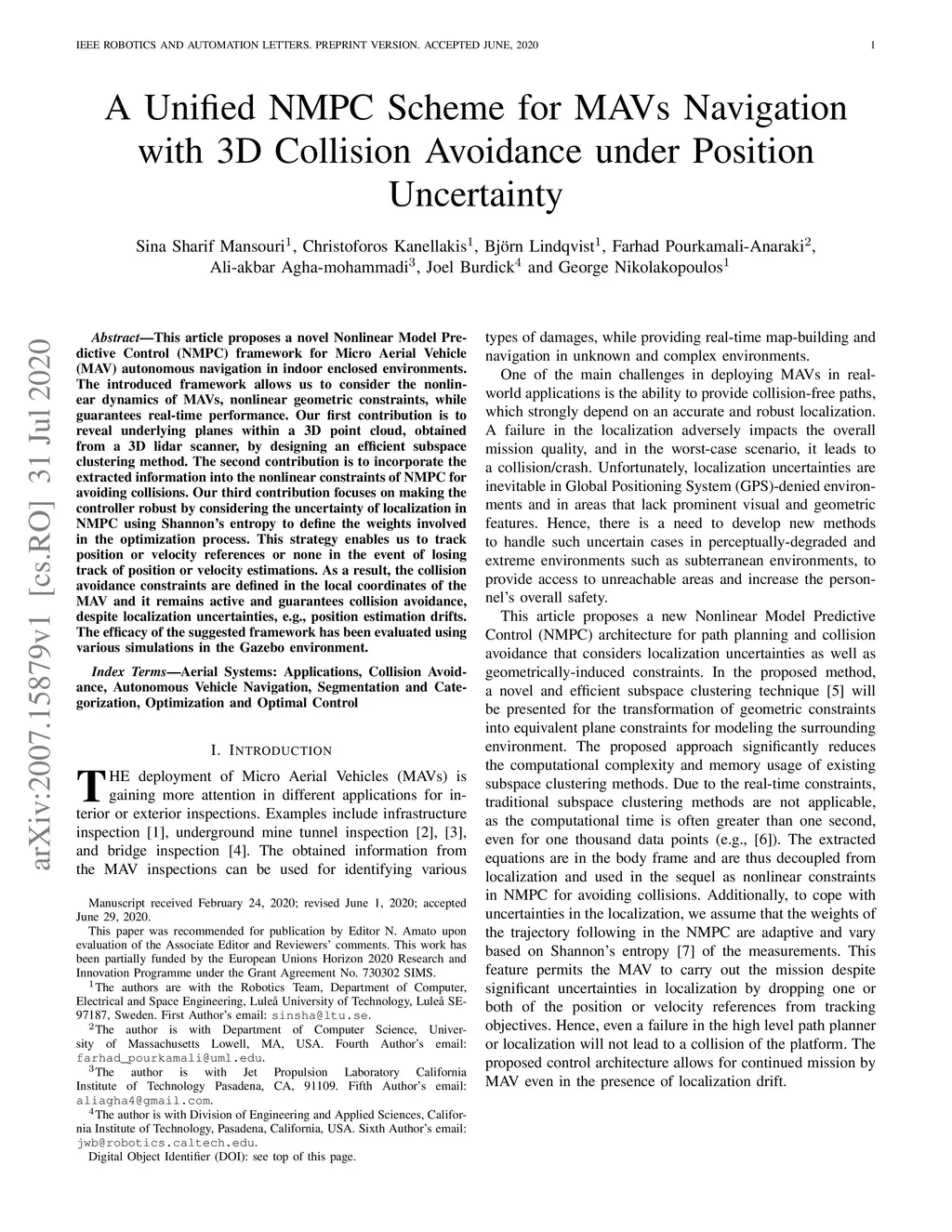 This article proposes a novel Nonlinear Model Predictive Control (NMPC) framework for Micro Aerial Vehicle (MAV) autonomous navigation in constrained environments. The introduced framework allows us to consider the nonlinear dynamics of MAVs and guarantees real-time performance. Our first contribution is to design a computationally efficient subspace clustering method to reveal from geometrical constraints to underlying constraint planes within a 3D point cloud, obtained from a 3D lidar scanner. The second contribution of our work is to incorporate the extracted information into the nonlinear constraints of NMPC for avoiding collisions. Our third contribution focuses on making the controller robust by considering the uncertainty of localization and NMPC using the Shannon entropy. This step enables us to track either the position or velocity references, or none of them if necessary. As a result, the collision avoidance constraints are defined in the local coordinates of MAVs and it remains active and guarantees collision avoidance, despite localization uncertainties, e.g., position estimation drifts. Additionally, as the platform continues the mission, this will result in less uncertain position estimations, due to the feature extraction and loop closure. The efficacy of the suggested framework has been evaluated using various simulations in the Gazebo environment.