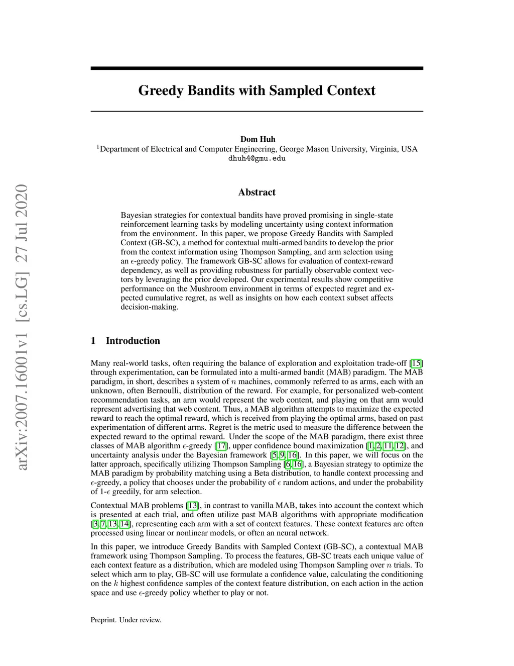 Bayesian strategies for contextual bandits have proved promising in single-state reinforcement learning tasks by modeling uncertainty using context information from the environment. In this paper, we propose Greedy Bandits with Sampled Context (GB-SC), a method for contextual multi-armed bandits to develop the prior from the context information using Thompson Sampling, and arm selection using an epsilon-greedy policy. The framework GB-SC allows for evaluation of context-reward dependency, as well as providing robustness for partially observable context vectors by leveraging the prior developed. Our experimental results show competitive performance on the Mushroom environment in terms of expected regret and expected cumulative regret, as well as insights on how each context subset affects decision-making.